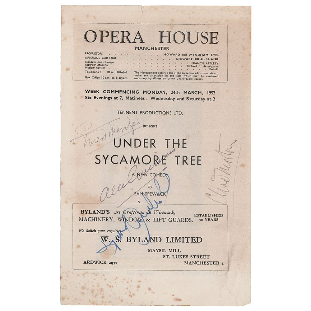 Original vintage 5.75 x 9 program page for a production of the play Under the Sycamore Tree, held at the Manchester Opera House in March 1952, signed in ballpoint and fountain pen by Ernest Thesiger and Alec Guinness. The page is also signed by Diana Churchill and Clive Morton. In very good to fine condition, with light creasing, scattered light foxing, and a short tear to the top edge.