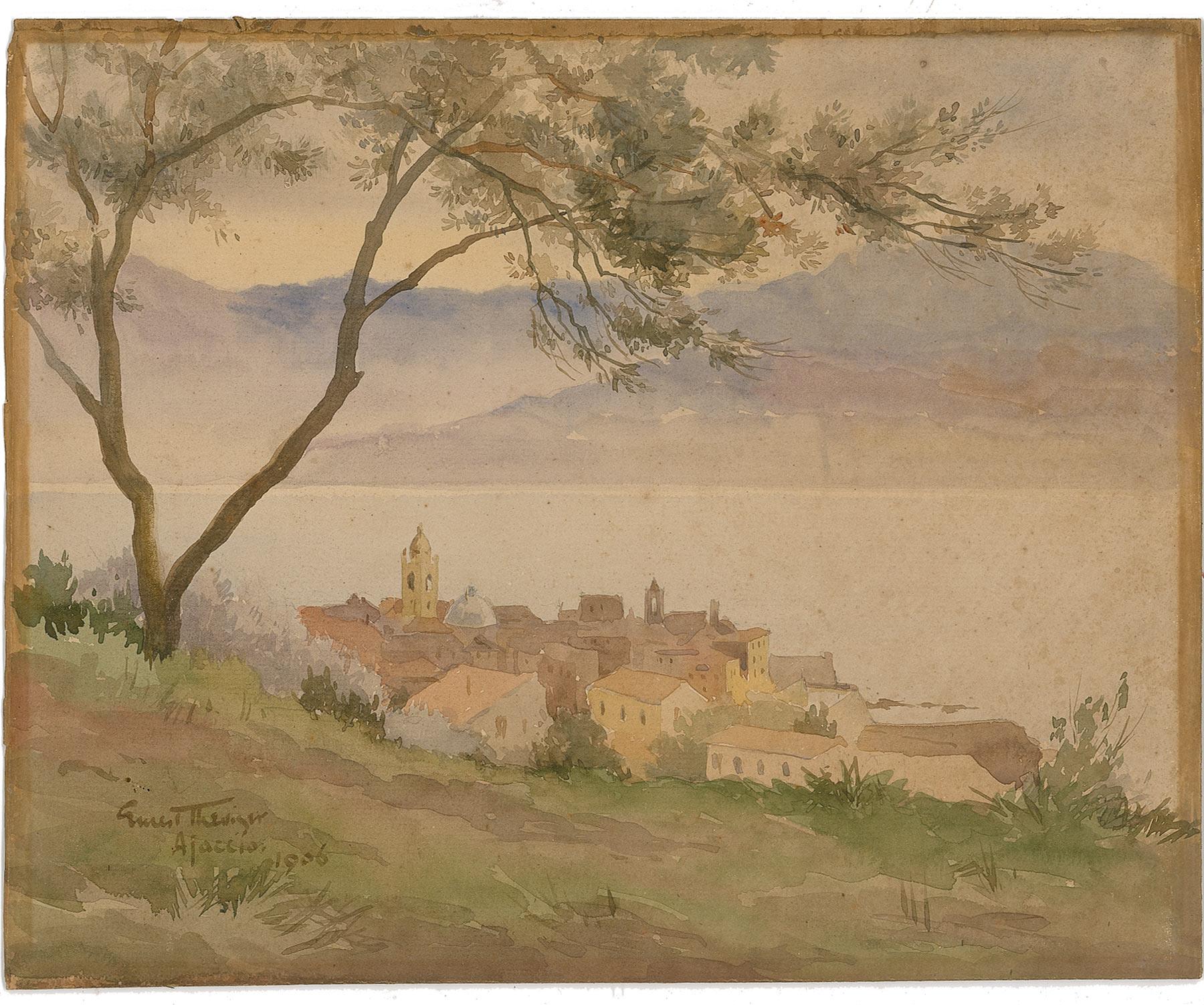 Extremely rare original watercolor painting of Ajaccio in Corsica done by Thesiger on an off-white 12 x 9.75 sheet affixed to an identical size board. Painting is done from a hilltop above the commune with water and mountains in the background. Signed in the lower left corner, in watercolor, “Ernest Thesiger, Ajaccio, 1906.” Consignor indicates this work was given to a socialite friend of Thesiger’s in the 1920s. Thin strips of edge toning, scattered light toning and foxing, and a few small edge tears and creases, otherwise fine condition.