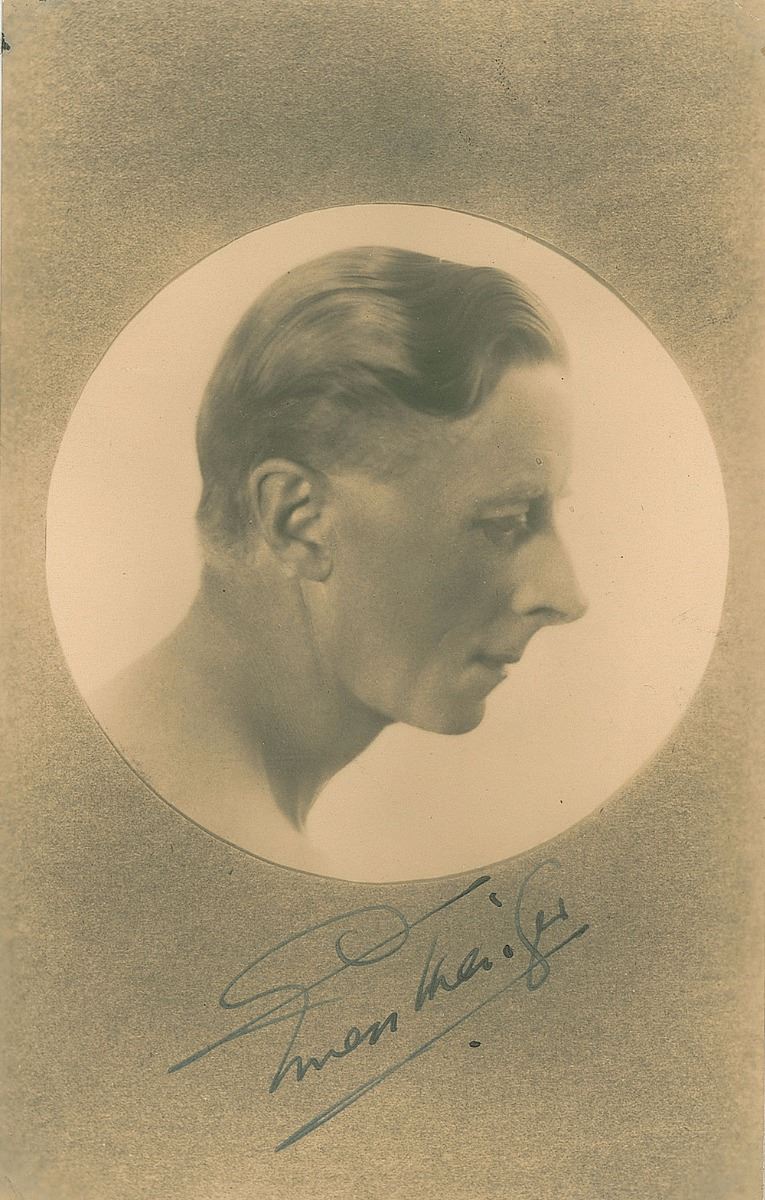Character actor (1879–1961) best remembered as the mad scientist Dr. Pretorius in The Bride of Frankenstein. Vintage matte-finish 3.5 x 5.25 profile portrait of Thesiger, signed below in fountain pen. Blindstamped in the lower right corner by the photography studio. In fine condition, with trivial creasing and adhesive remnants to upper corners.