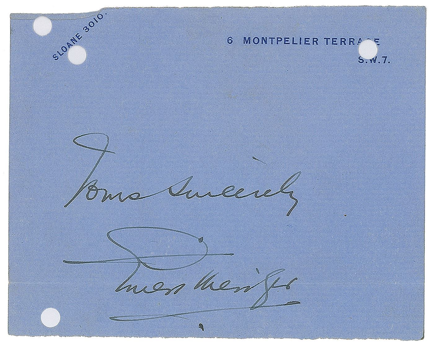 Character actor (1879–1961) best remembered as the mad scientist Dr. Pretorius in The Bride of Frankenstein. Fountain pen signature, "Yours sincerely, Ernest Thesiger,” on a blue 4.5 x 3.5 trimmed sheet of 6 Montpelier Terrace stationery. In fine condition, with a horizontal fold passing through the signature and several inexplicable holes to the sheet.