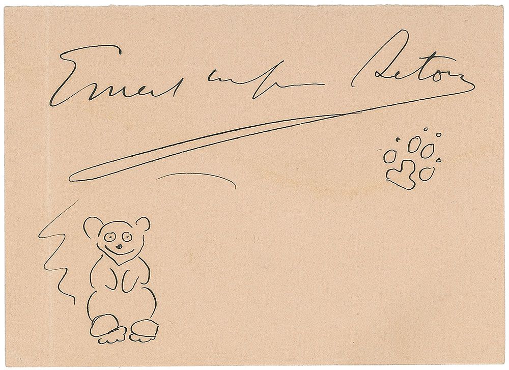 Nature writer (1860–1946) who founded the modern school of animal fiction and helped found the Boy Scouts of America. Original vintage signed ink sketch of a small bear and paw print on an off-white 5 x 3.5 sheet. In fine condition, with a vertical fold along left edge.