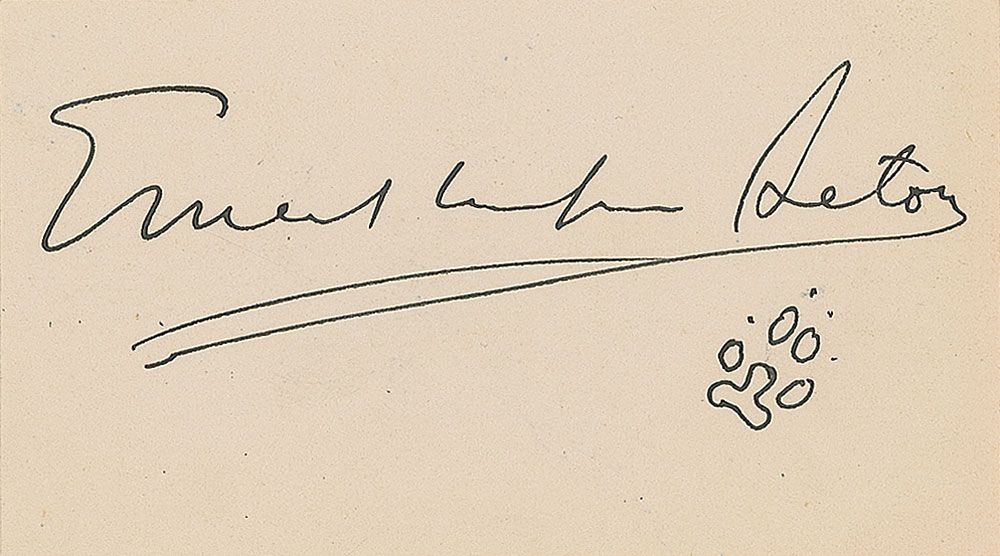 Nature writer (1860–1946) who founded the modern school of animal fiction and helped found the Boy Scouts of America. Ink signature, “Ernest Thompson Seton,” along with a small paw print sketch, on an off-white 3.25 x 1.75 card. In fine condition.