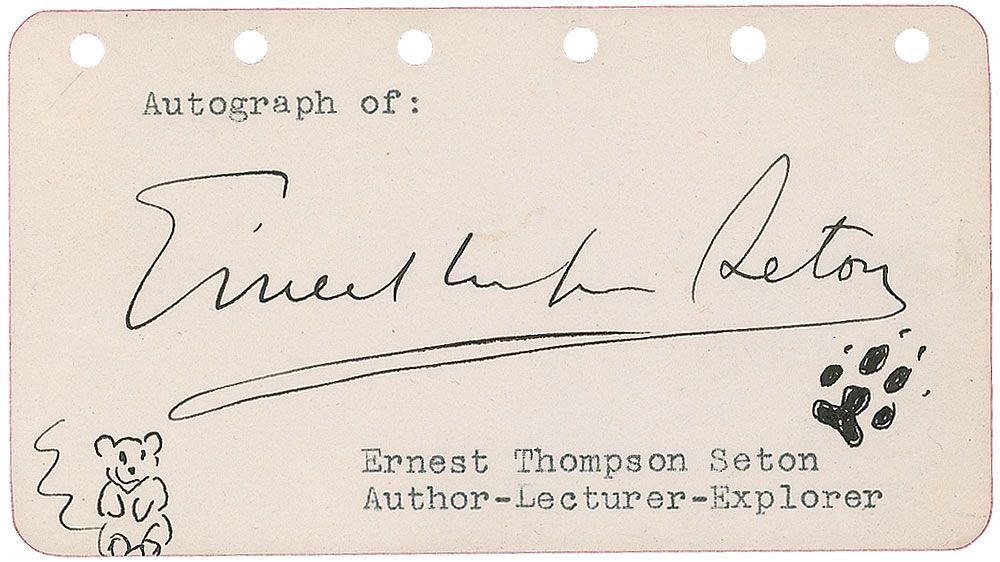 Vintage fountain pen signature, “Ernest Thompson Seton,” above small sketches of a paw print and a bear, on an off-white 4.5 x 2.5 page. In fine condition.