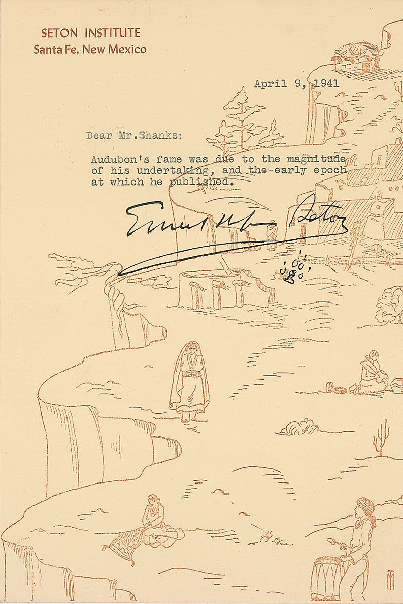 Nature writer (1860–1946) who founded the modern school of animal fiction and helped found the Boy Scouts of America. TLS, signed “Ernest T. Seton,” one page, 6.25 x 9, decorative Seton Institute letterhead, April 9, 1941. Brief letter reads, in full: “Audubon’s fame was due to the magnitude of his undertaking, and the early epoch at which he published.” Boldly signed at the conclusion by Seton, adding a small paw print sketch under his signature. In fine condition.