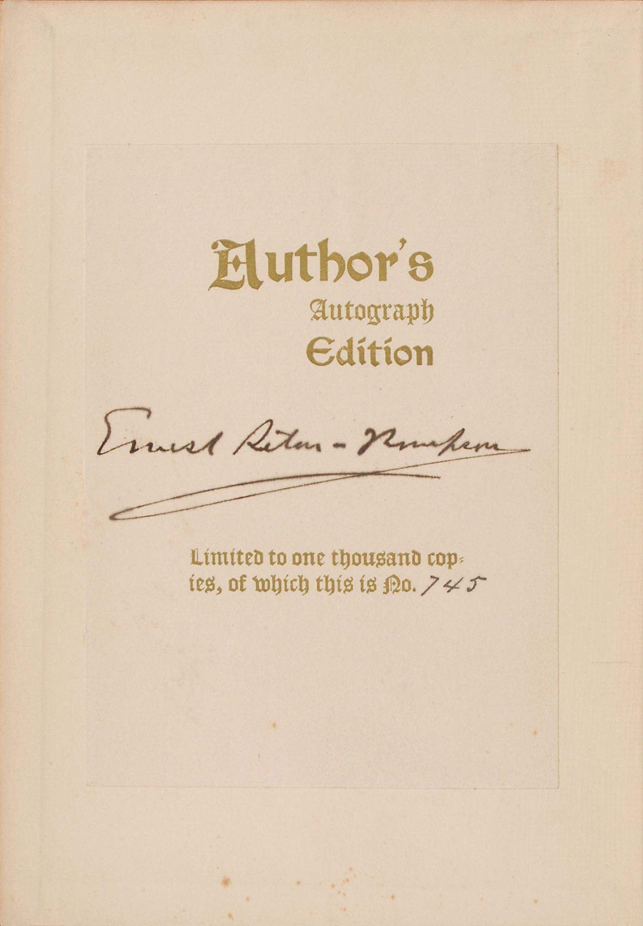 Signed book: Wild Animals I Have Known. Limited edition, ninth impression, numbered 745/1000. NY: Charles Scribner's Sons, 1900. Hardcover, 5.75 x 8.25, 359 pages. Signed on the numbered bookplate affixed to the front pastedown in black ink. In fine condition.