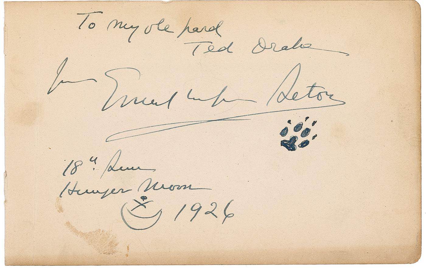 Fountain pen signature and inscription, “To my old pard Ted Drake from Ernest Thompson Seton, 18th Sun Hunger Moon 1926,” adding a small paw print sketch as well as a sketch of the moon, on an off-white 7 x 4.5 album page. In very good condition, with light toning to page, heavier at edges, vertical crease to left edge, and scattered light soiling.
