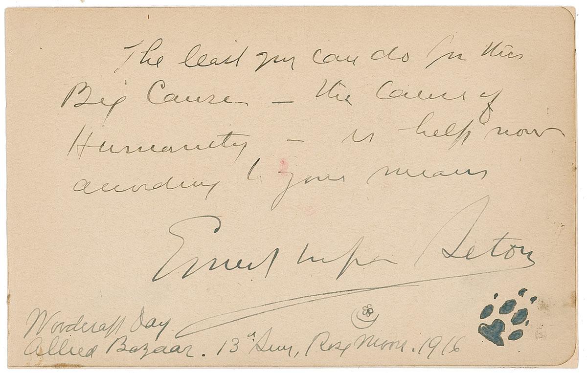 AQS on an off-white 6 x 4 album page, Seton writes: “The least you can do for this Big Cause—the cause of Humanity—is help now according to your means.” Signed at the conclusion, “Ernest Thompson Seton, Wordcraft Day, Allied Bazaar, 13th Sun, Rose Moon 1916” adding a small sketch of a bear paw and a moon and flower under his signature. Page is affixed to an identical size sheet. In fine condition, with scattered light soiling, and a uniform shade of mild toning.