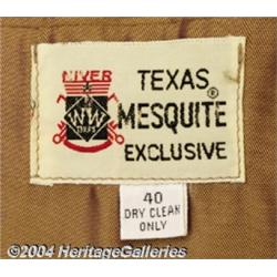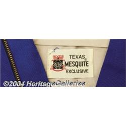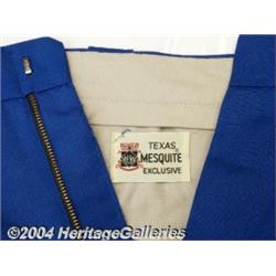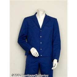 <B>Ernest Tubb Suit Designed by Texas Mesquite</B></I>. Ernest Tubb had a career that spanned half a century, from his first radio date in 1932 until his death in 1984. He had a long association with Decca Records, beginning with his recording of "Blue-Eyed Elaine" in 1940. After his song, "Walkin' the Floor Over You" became a country classic in 1943, Tubb would achieve movie roles, a spot in the Opry, and major stardom with his own show, "The "Midnight Jamboree." During his career Ernest Tubb racked up over fifty hit songs, many being his own compositions. He was the 6th member elected to the Country Music Hall of Fame in 1965. Despite suffering from emphysema, he continued to perform to packed houses right up until his death. Tubb certainly left a legend and a legacy for his legion of fans. Texas Mesquite designed this blue two-piece tradition western style suit for the country legend. The coat and pants are in good condition and would be excellent for display. <BR><BR><B>Important notice:</B> Heritage usually auctions material at the rate of 200-250 lots per hour. On some occasions eBay Live bid software or the Internet may not be able to keep up with the pace of the auction. We recommend placing a realistic absentee bid now as insurance to avoid disappointment. Occasionally the auctioneer may eliminate or reject an eBay Live bid, and the auctioneer may also reopen a lot after the close of the eBay live bidding (usually because we missed an audience bid), and may reject your bid even if it shows you as the winning bidder. By bidding via eBay Live, you agree that Heritage may award the lot to another bidder at its sole discretion under the circumstances described above or any other reasonable circumstances. Since eBay bids are not shown to us until we open the lot on the floor, we treat those bids just like floor bids. In most cases the floor responds before the eBay bid is presented to us, due to Internet lag time, so for consistency we have made it a policy that floor bids are always considered first over tie eBay live bids. Also please note that all Heritage lots purchased through eBay Live carry a 24.5% Buyer's Premium. Please make sure you read the Terms and Conditions before you bid.