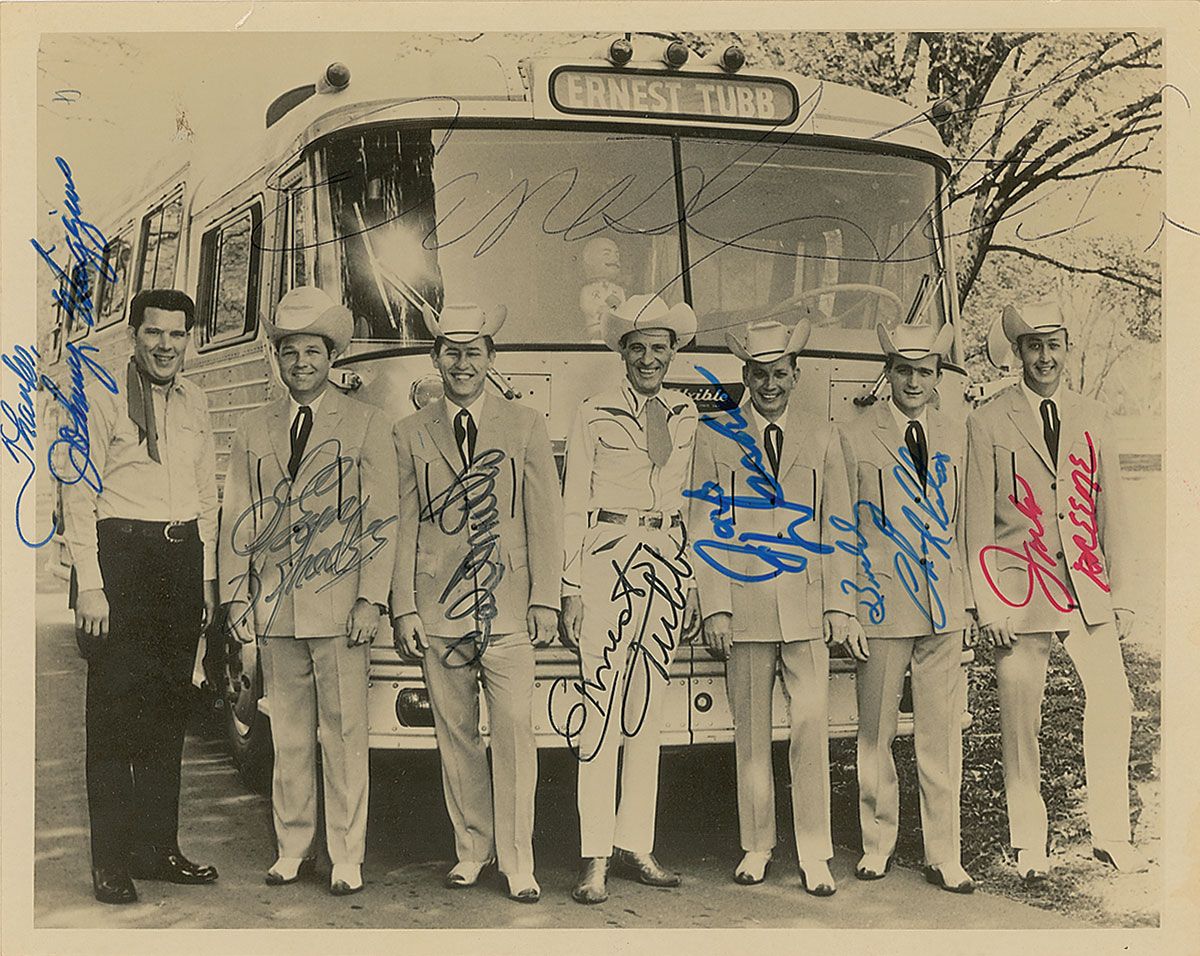 Vintage glossy 10 x 8 photo of Tubb and his band posing in front of their tour bus, signed later in various color felt tip by Ernest Tubb, Johnny Wiggins (signing over an unsuccessful first attempt in blue ballpoint), Cal Smith, Buddy Charleton, Leon Rhodes, Jack Greene, and Jack Drake. Scattered silvering to darker areas, a small tear to top edge, and a ballpoint notation “Ernest Tubb” in another hand across upper portion of photo, otherwise fine condition.