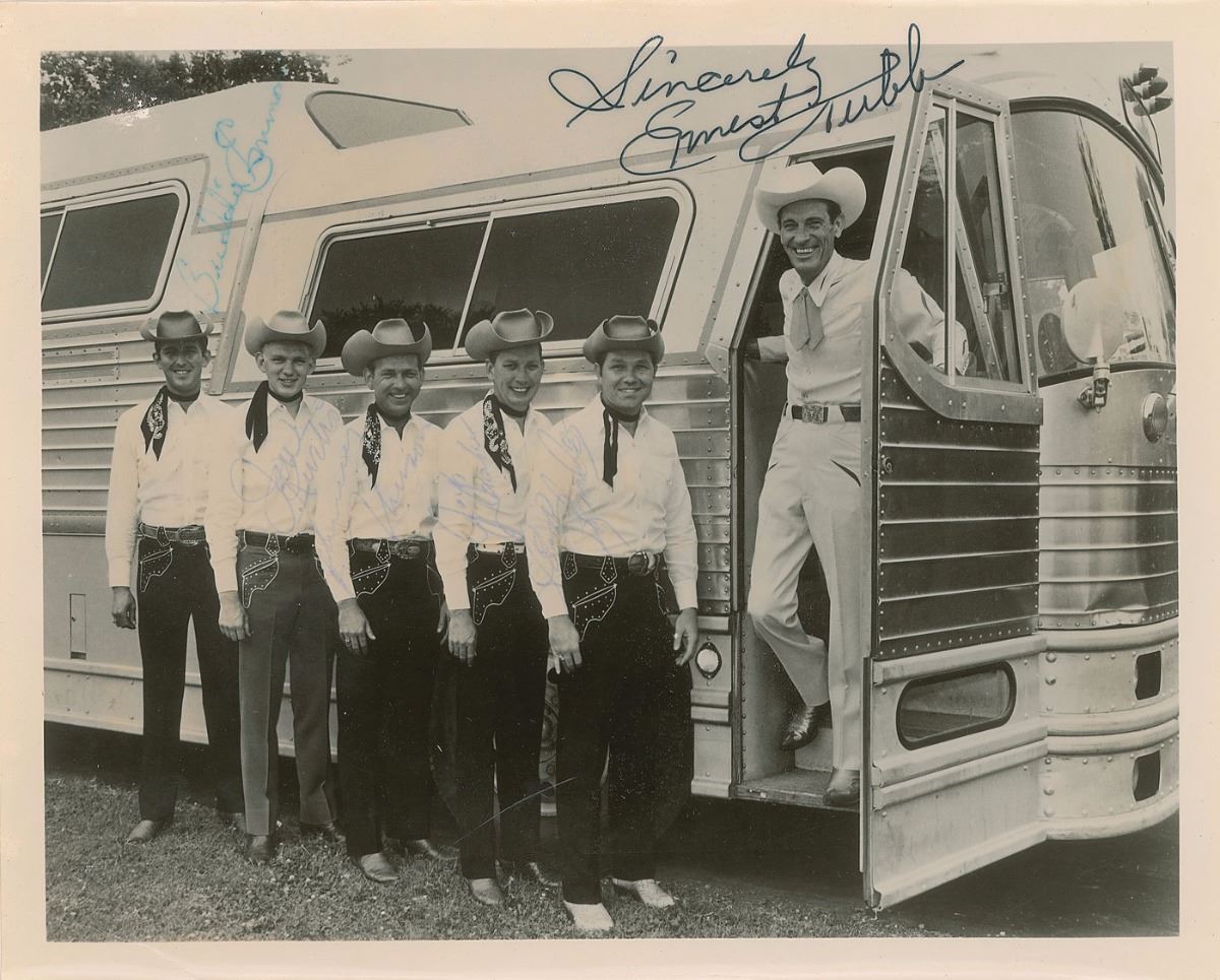 Glossy 10 x 8 photo of the Texas Troubadours and their tour bus, signed in black felt tip by Tubb and in light blue ballpoint by Buddy Emmons, Jan Kurtis, Jack Drake, Leon Rhodes, and Jimmy Johnson. Light creases and spotting to emulsion, trivial specks of surface loss to upper left corner, and the Troubadours’ signatures faded but legible, otherwise fine condition.