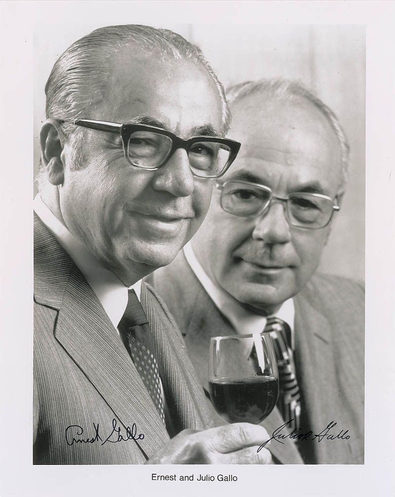 Brothers who founded the E.&J. Gallo Winery in 1933, at the end of Prohibition. Glossy 8 x 10 photo of the Gallos, signed in black felt tip by Ernest and Julio. In fine condition, with a couple light creases.