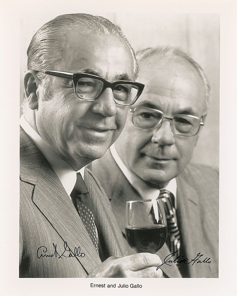 Billionaire brothers who founded the E & J Gallo Winery in 1933 at the end of Prohibition. Glossy 8 x 10 photo of the brothers holding their famous wine, signed at the bottom in black felt tip by both. In fine condition, with a couple surface creases.
