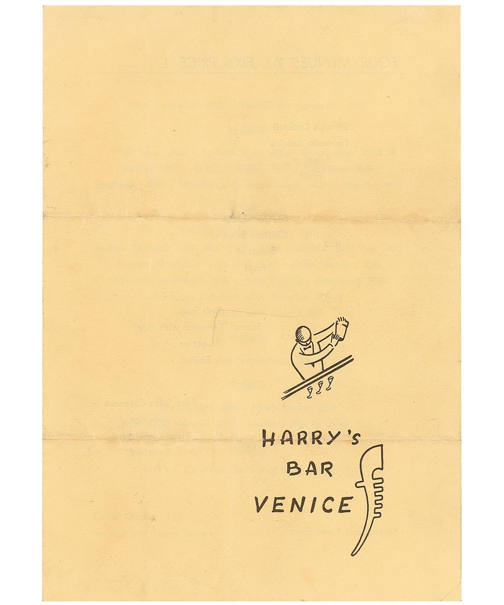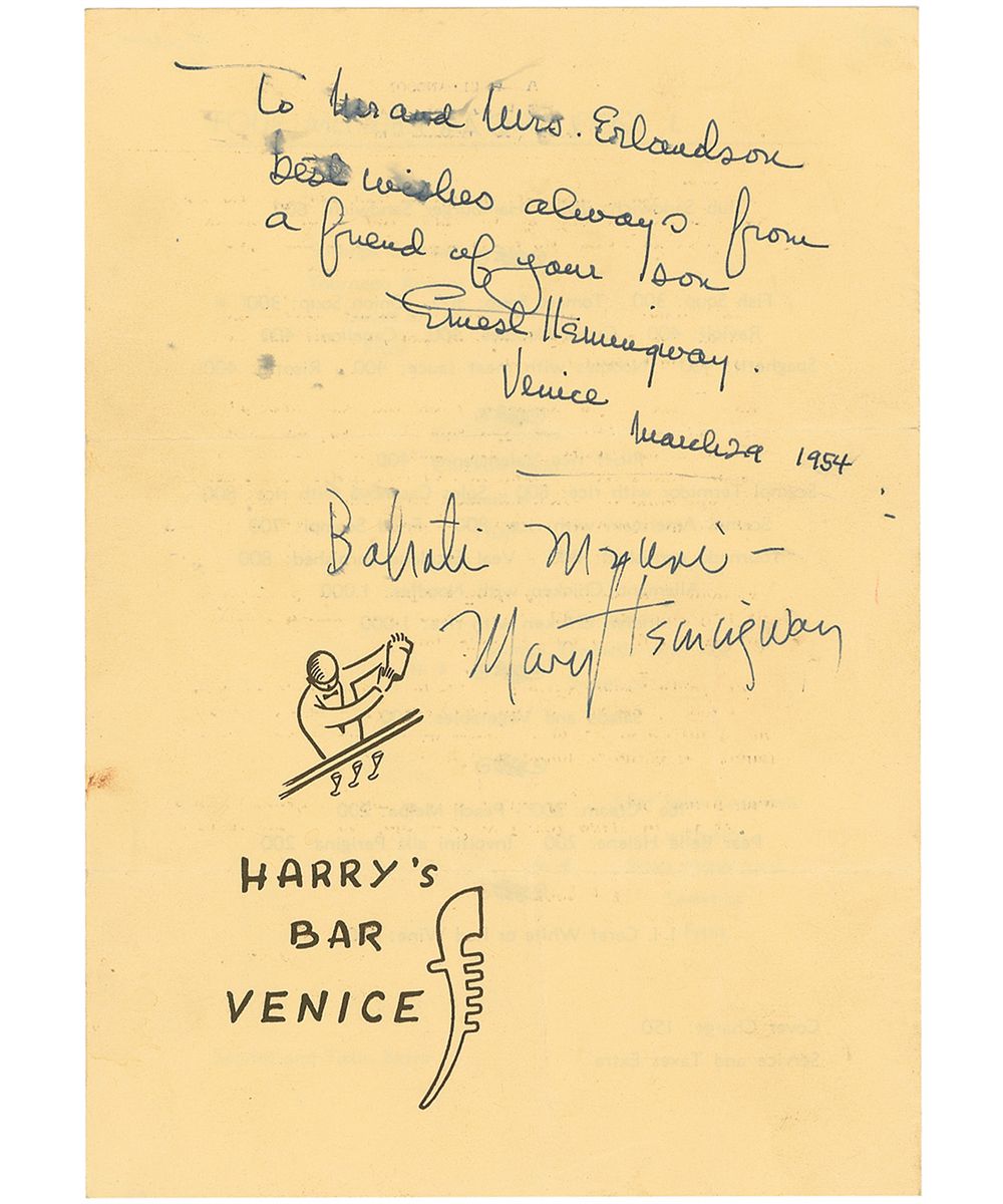 Original menu from Harry’s Bar, Venice, 6 x 8.5, two pages. Signed and inscribed on the back cover in black ink, “To Mr. and Mrs. Erlandson, best wishes always from a friend of your son, Ernest Hemingway, Venice, March 29, 1954,” and also signed underneath by his wife, “Mary Hemingway,” adding a brief Italian sentiment above her signature. In very good condition, with several small moisture spots to Hemingway’s inscription, two horizontal folds and one light central vertical fold, and scattered creases. Hemingway was a regular at Harry’s Bar from 1949 on and he set scenes in the bar in his novel Across the River and into the Trees.