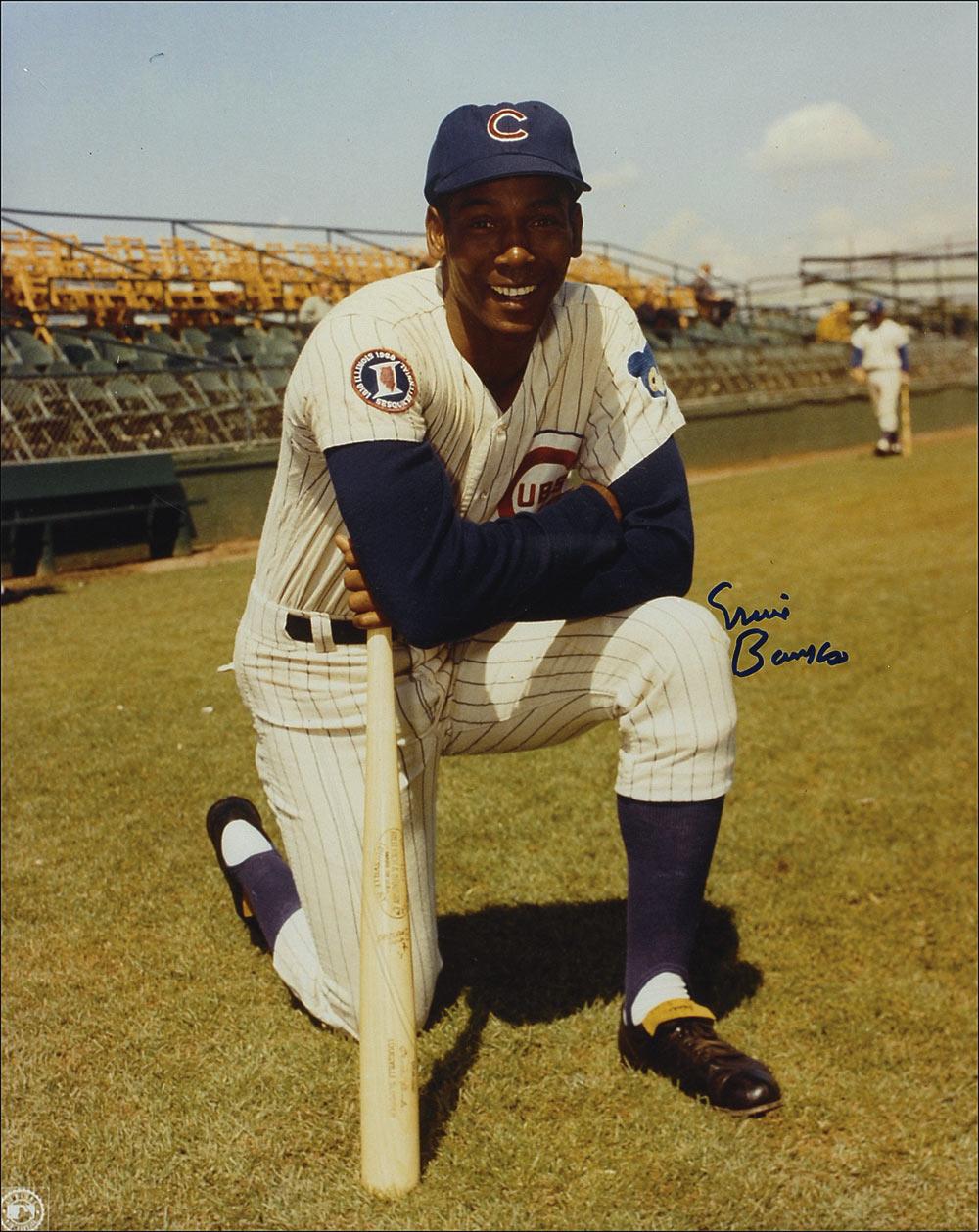 Color glossy 16 x 20 photo of ‘Mr. Cub,’ taking a knee, signed in blue felt tip. In fine condition. Pre-certified Steve Grad/PSA/DNA and RRAuction COA.