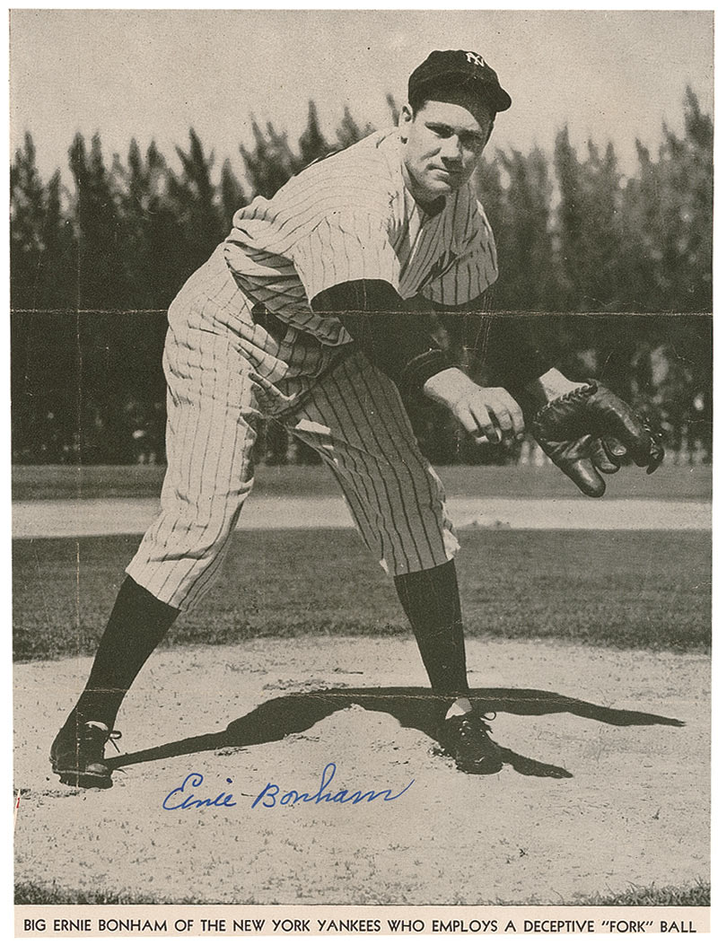 Starting pitcher (1913-1949) for the NY Yankees and Pittsburgh Pirates in the 1940s. Vintage 7.5 x 9.5 magazine photo of Bonham throwing a pitch, affixed to a sheet of the same size, signed in blue fountain pen. In very good condition, with intersecting folds, one affecting the signature, scattered creasing, and trimmed edges. Accompanied by a full letter of authenticity from PSA/DNA.