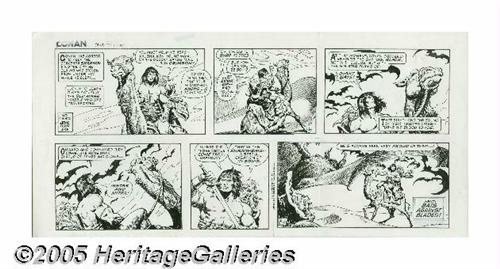 <B>Ernie Chan - Conan Sunday Comic Strip Original Art, dated 2-18-79 (King Features Syndicate, 1979).</B></I> In this thrilling Sunday, Conan is attacked by giant bats in the desert. The image area measures 21" x 9.5", and the art is in Excellent condition. Ernie Chan (earlier named Chua) began his career as an assistant to Tony DeZuniga, during Tony's work on romance features, and Ernie was the third Filipino talent to work at DC, but he soon moved over to Marvel where he established himself as a fan-favorite with his inking over John Buscema's pencils on Conan. Shortly thereafter Ernie handled the complete art chores on the <I>Conan</B></I> comic strip, and this Sunday is a splendid example of his talent..