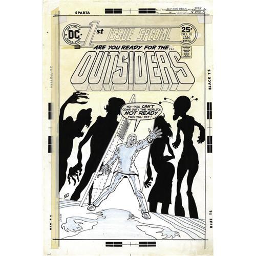 <B>Ernie Chan - First Issue Special #10 Cover Original Art (DC, 1976).</B></I> Are you ready for the Outsiders? "Doc" Goodie, and his group of sideshow freaks get the Ernie Chan touch in this cover illustration. The image area measures 10" x 15", and includes the original logo and masthead paste-up art. Some aging is apparent, with a few glue stains; otherwise the condition is Very Good.<BR><BR><b>Shipping:</b> Small Flat (<a target="_blank" href="http://www.heritageauctions.com/common/shipping.php">view shipping information</a>)