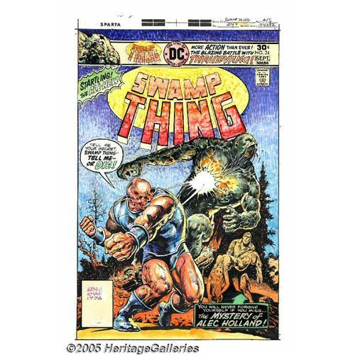 <B>Ernie Chan - Swamp Thing #24 Cover Hand Colored By the Artist Original Art (DC, 1976).</B></I> More action than ever before -- a blazing battle between the creature formerly known as Alec Holland, and Thrudvang, the Earth-Master, covers this 24th and final issue, with art by Ernie Chan! The image area measures 10"" x 15"" and the art is in Excellent condition. This muck-encrusted slug-fest comes complete with all original logo, masthead, and title type, and is signed by Ernie Chan at the lower left. <BR><BR><B>Important notice:</B> Heritage usually auctions material at the rate of 200-250 lots per hour. On some occasions eBay Live bid software or the Internet may not be able to keep up with the pace of the auction. We recommend placing a realistic absentee bid now as insurance to avoid disappointment. Occasionally the auctioneer may eliminate or reject an eBay Live bid, and the auctioneer may also reopen a lot after the close of the eBay live bidding (usually because we missed an audience bid), and may reject your bid even if it shows you as the winning bidder. By bidding via eBay Live, you agree that Heritage may award the lot to another bidder at its sole discretion under the circumstances described above or any other reasonable circumstances. Since eBay bids are not shown to us until we open the lot on the floor, we treat those bids just like floor bids. In most cases the floor responds before the eBay bid is presented to us, due to Internet lag time, so for consistency we have made it a policy that floor bids are always considered first over tie eBay live bids. Also please note that all Heritage lots purchased through eBay Live carry a 20% Buyer's Premium. Please make sure you read the Terms and Conditions before you bid. This lot is being auctioned in conjunction with a live floor auction by Heritage Galleries & Auctioneers. All final auction and invoice information will be supplied by Heritage Galleries & Auctioneers, and all other information should be con