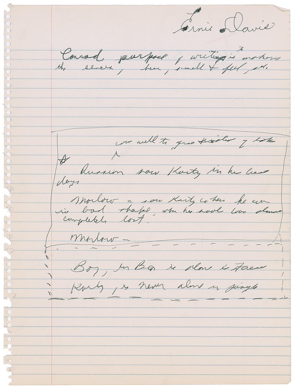 Star running back at Syracuse University; first black player to win the Heisman Trophy (1961); drafted by the Washington Redskins and traded to Cleveland but died the following year from leukemia before playing a pro game. A full page of Davis’ handwritten homework notes, signed “Ernie Davis” in black ballpoint, on a lined 8 x 11 sheet of paper removed from a spiral notebook. Davis has written notations on Joseph Conrad’s novel Heart of Darkness with over 40 words written in Davis’ hands. In part: “Marlow = now Kurtz when he was in bad shape, when he…was almost completely lost…Boy, in Bed is alone is False. Kurtz, is never alone in jungle.” In fine condition, with rough left edge, vertical fold, and faint edge toning.
