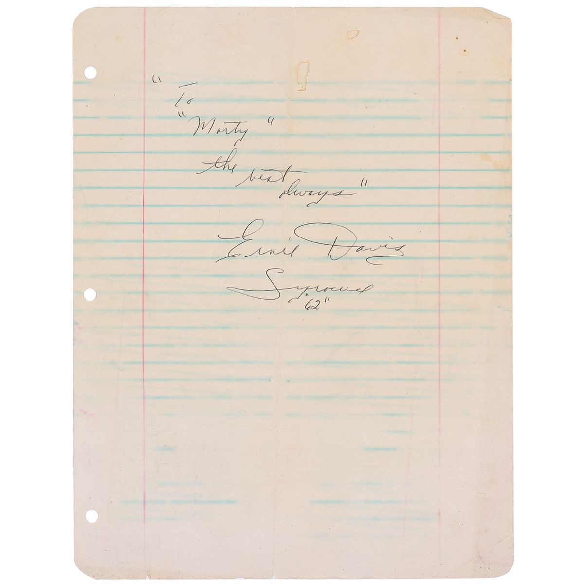 Star running back at Syracuse University; first black player to win the Heisman Trophy (1961); drafted by the Washington Redskins and traded to Cleveland but died the following year from leukemia before playing a pro game. Vintage ink signature and inscription, “’To ‘Marty’ the best always’ Ernie Davis, Syracuse ‘62’,” on an off-white 8.5 x 11 lightly-lined sheet. In very good condition, with central vertical fold through a single letter of signature, and scattered wrinkling, toning and damp staining, resulting in light bleeding of some of the pre-printed lines.