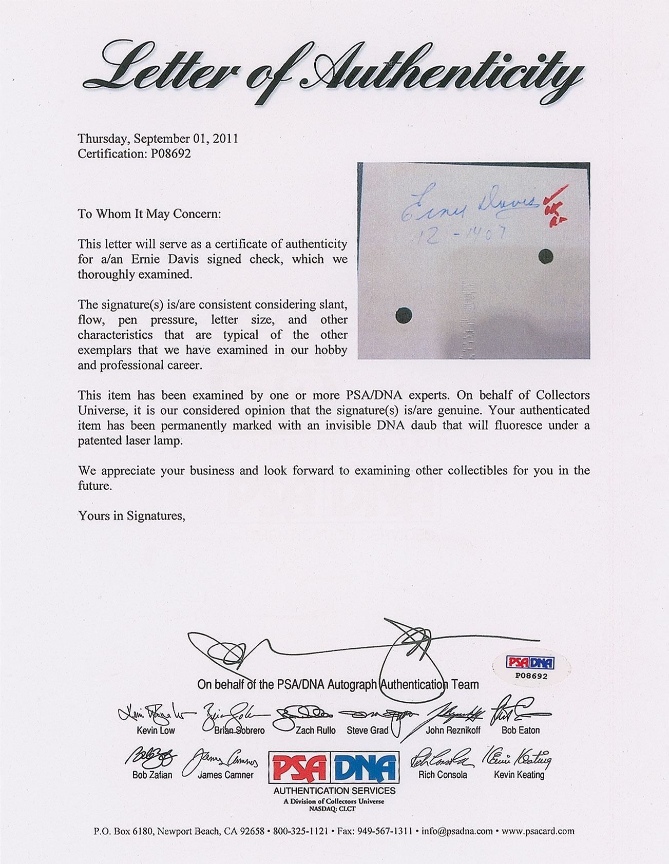 Cleveland Browns Football Company check, 8.5 x 3.5, filled out in type and made payable to Ernest R. Davis for $2500, February 22, 1963. Endorsed on the reverse in blue ballpoint, "Ernie Davis." In fine condition, with several cancellation punch holes. Davis was drafted with the No. 1 overall pick in the 1962 NFL draft and immediately traded to the Cleveland Browns, signing a three-year contract for $200,000 in late December 1961. Less than three months after endorsing this check, Davis succumbed to leukemia at the of age 23. Only the second signed check from Davis that we have offered. Accompanied by a full letter of authenticity from PSA/DNA.
