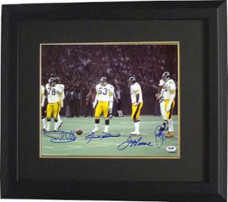 The Steel Curtain was the nickname given to the front four of the famous defensive line of the Pittsburgh Steelers during their 1970s dynasty years. This defense was the backbone of the Steelers dynasty, which won 4 Super Bowls (IX, X, XIII, and XIV). This is a hand autographed Pittsburgh Steelers Steel Curtain 11x14 Photo. 4 Autographs include: Joe Greene, Dwight White (deceased), Ernie Holmes (deceased), and LC Greenwood. PSA Hologram and Certificate of Authenticity. Custom Black Mat and Premium Black Color Framed as shown.