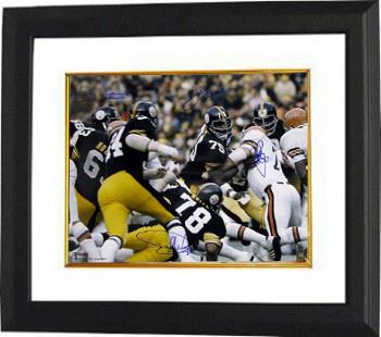 The Steel Curtain was the nickname given to the front four of the famous defensive line of the Pittsburgh Steelers during their 1970s dynasty years. This defense was the backbone of the Steelers dynasty, which won 4 Super Bowls (IX, X, XIII, and XIV). This is a hand autographed Pittsburgh Steelers Steel Curtain 16x20 Photo. 4 Autographs include: Joe Greene, Dwight White (deceased), Ernie Holmes (deceased), and LC Greenwood. Certificate of Authenticity from Athlon Sports. Custom White Mat and Premium Black Color Framed as shown.