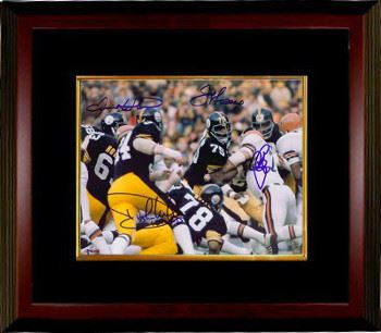 The Steel Curtain was the nickname given to the front four of the famous defensive line of the Pittsburgh Steelers during their 1970s dynasty years. This defense was the backbone of the Steelers dynasty, which won 4 Super Bowls (IX, X, XIII, and XIV). This is a hand autographed Pittsburgh Steelers Steel Curtain 8x10 Photo. 4 Autographs include: Joe Greene, Dwight White (deceased), Ernie Holmes (deceased), and LC Greenwood (deceased). Certificate of Authenticity from Athlon Sports Collectibles. Custom Black Mat and Premium Mahogany Color Framed as shown.