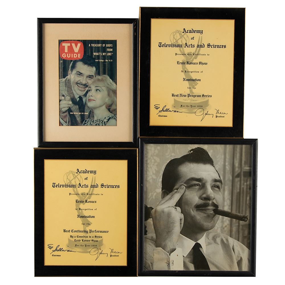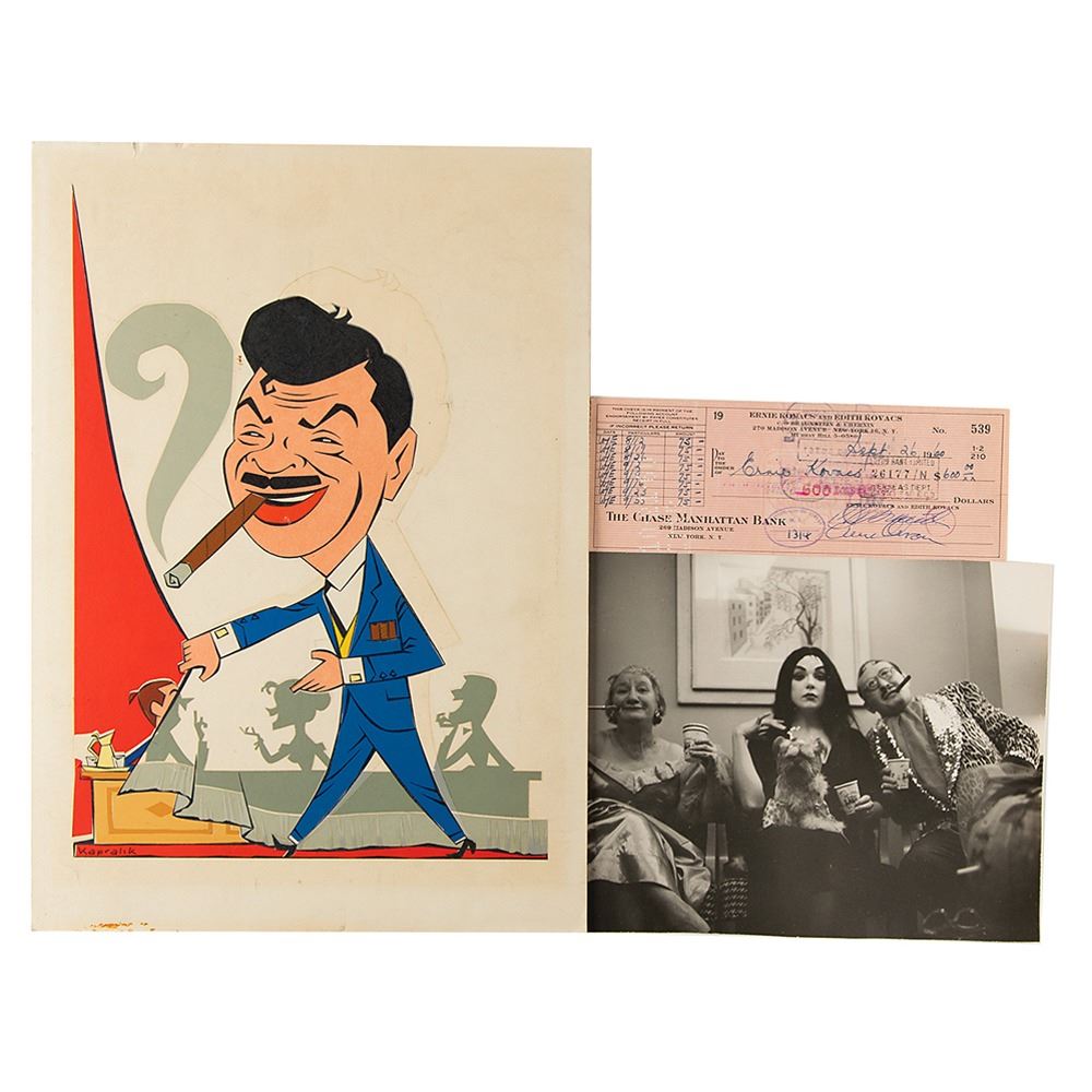 Influential American comedian, actor, and writer (1919–1962) whose improvisational humor and sense of visual style made him one of the most distinctive personalities in the early days of television. Interesting archive of material affiliated with Ernie Kovacs, including: two original Emmy Award nomination plaques, 9 x 11, presented to "Ernie Kovacs Show in Recognition of Nomination for the Best New Program Series for the Year 1956" and to "Ernie Kovacs in Recognition of Nomination for the Best Continuin Performance By a Comedian in a Series, Ernie Kovacs Show, for the Year 1956"; a personal check filled out in another hand and made payable to Kovacs for $600, September 26, 1960, signed on the front in blue ballpoint by Ernie Kovacs, and endorsed by him on the reverse; an original piece of artwork portraying Kovacs by Jacques Kapralik, a noted MGM caricaturist, done on an off-white 11 x 15.5 artist's board; a semi-glossy 9 x 11 portrait of Kovacs with his trademark cigar in his mouth; a humorous matte-finish 9.25 x 7.5 photo of Kovacs dressed in a leopard-print jacket; and a framed TV guide cover. In overall fine condition.