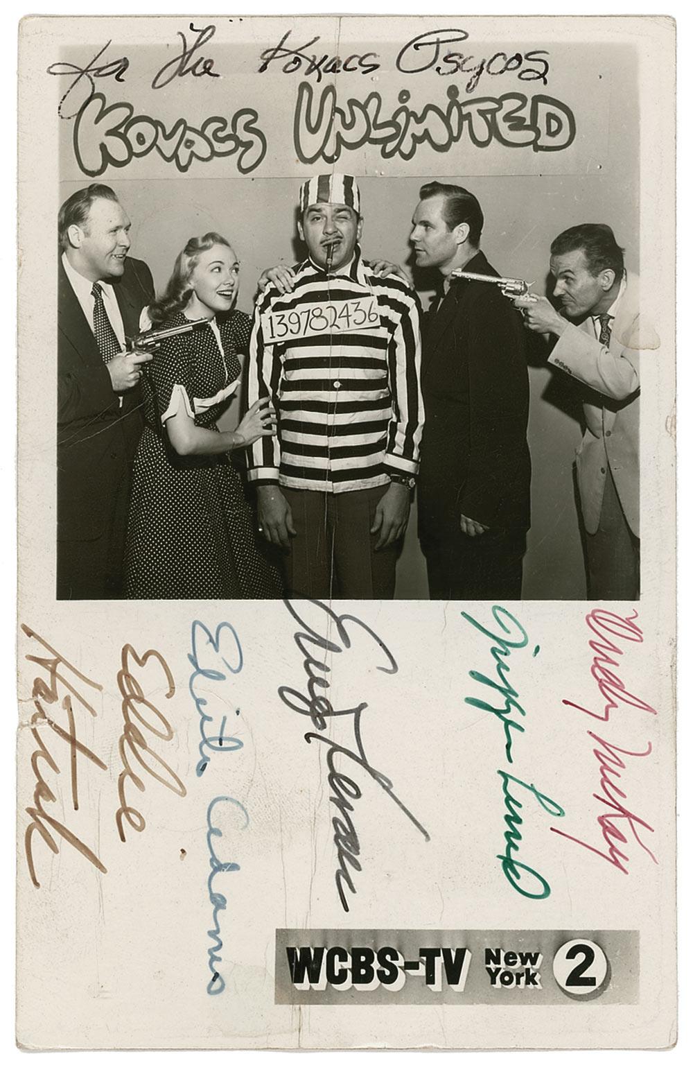Quirkily brilliant entertainer (1919–1962) whose freewheeling sense of humor and sense of visual style made him one of the most distinctive personalities in the early days of television. He died in an auto crash while driving the notoriously “unsafe at any speed” Chevrolet Corvair. Vintage glossy 5.5 x 3.5 promotional postcard photo for WCBS-TV’s Kovacs Unlimited, signed in black ink by Kovacs, and also signed in various color ink by cast members Edie Adams, Eddie Hatrak, Triggie Lund, and Andy McKay. In very good condition, with central moderate horizontal crease, other scattered creases and surface impressions, and some light silvering to image.