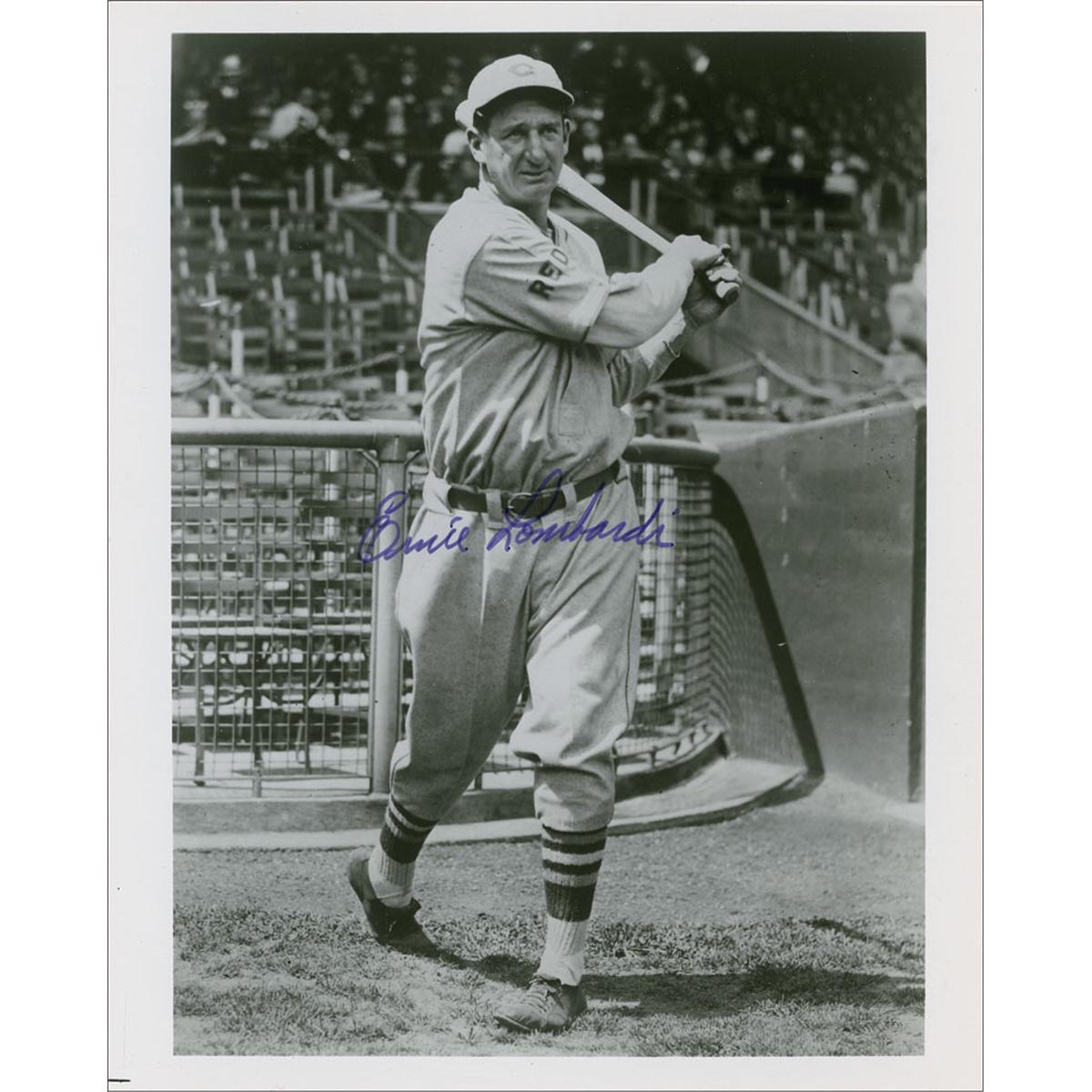 Glossy 8 x 10 photo of ‘The Schnozz’ (d. 1977) during batting practice, signed in blue ink, “Ernie Lombardi.” In fine condition.