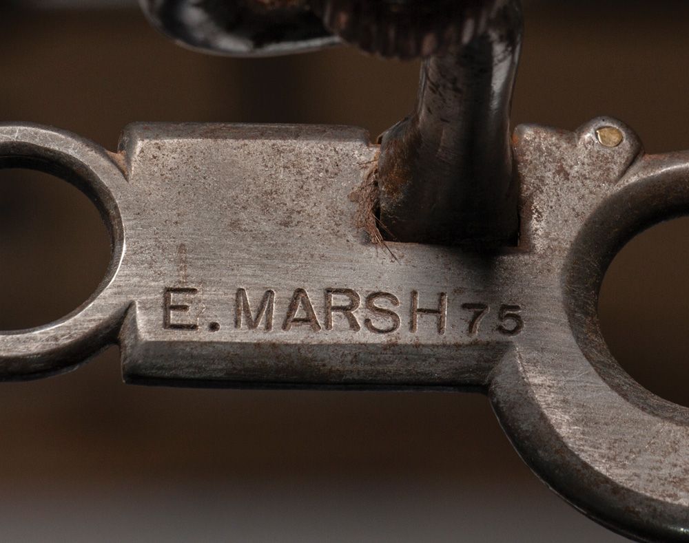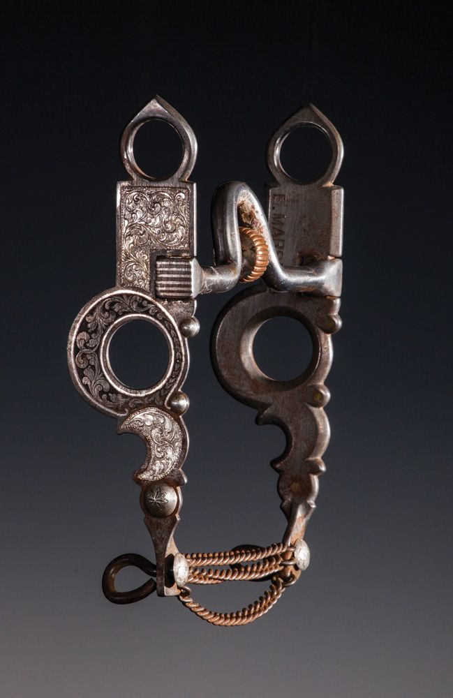 Ernie Marsh, TCAA Inlaid Bit. Maker-marked E. MARSH 75 and 1994, this elegant half-breed bit with beveled cheeks and quadruple slobber chains features the best of Ernie's intricate iron gun style engraving surrounded by highly detailed silver inlays. Excellent condition. PROVENANCE: Dick Powell Collection, Casa Grande, Arizona.
