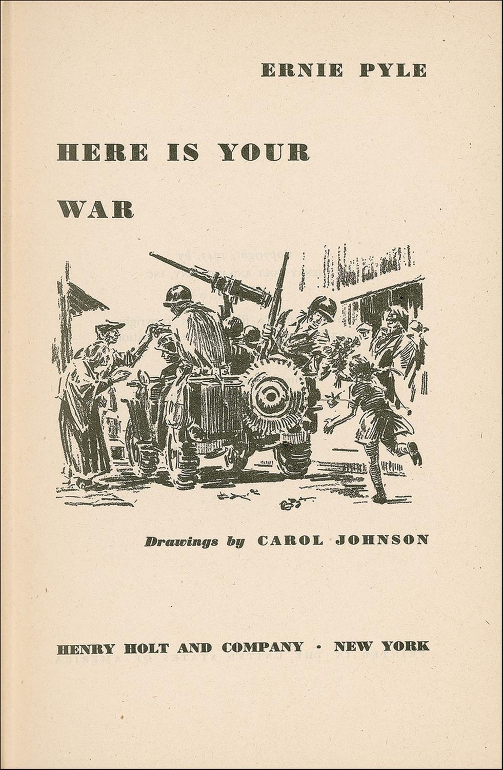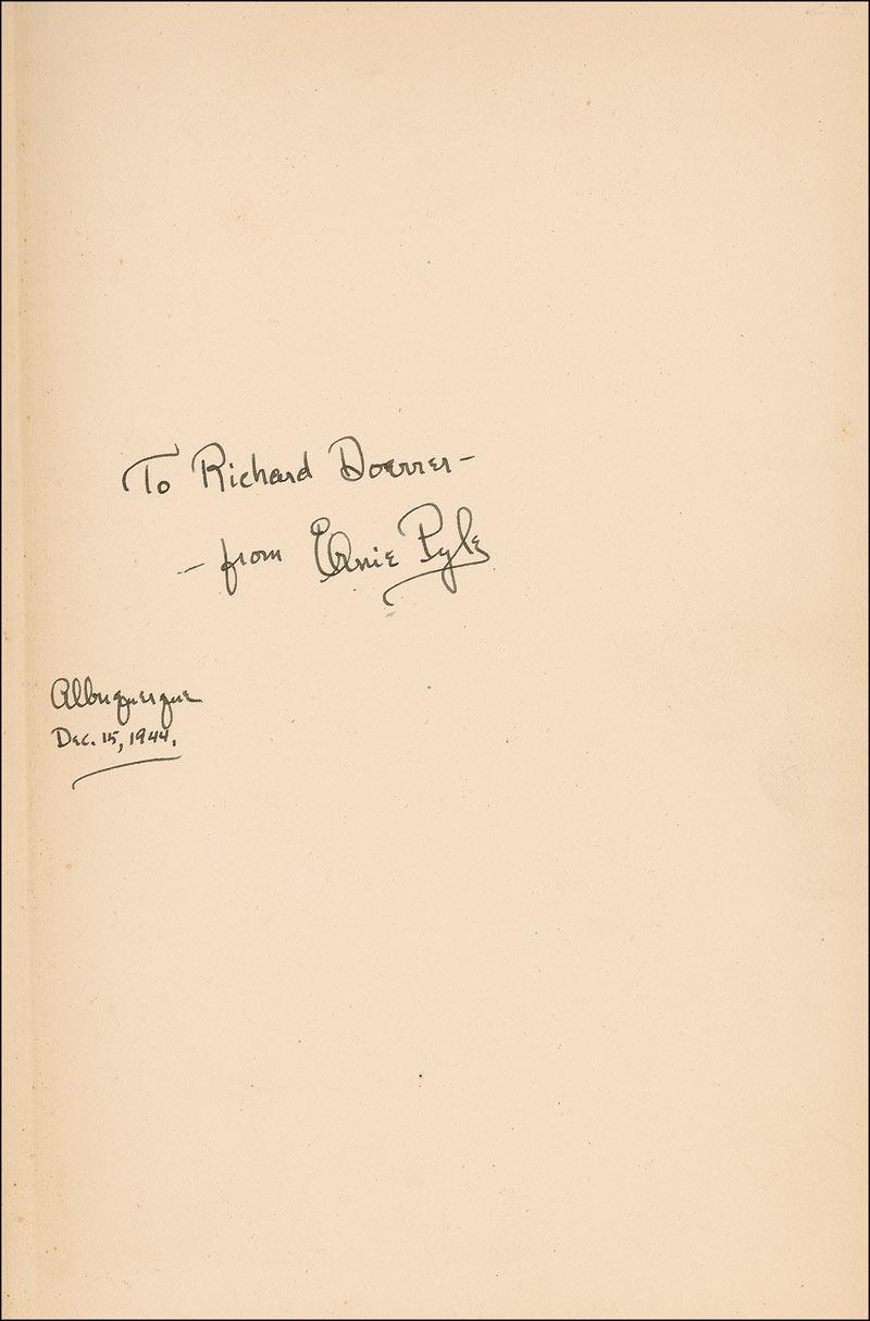 Pulitzer Prize–winning American journalist (1900–1945), best known for his wartime columns about ordinary GIs, who was killed during the Okinawa Campaign. Signed book: Here Is Your War. Later printing. NY: Henry Holt and Company, Inc., 1943. Hardcover, 5.75 x 8.5, 304 pages. Signed and inscribed on the first free end page, “To Richard Doerrer—from Ernie Pyle. Albuquerque, Dec. 15, 1944.” Toning to the signed page, some soiling to the spine, the spine a bit loose but all of the pages intact, otherwise fine condition.