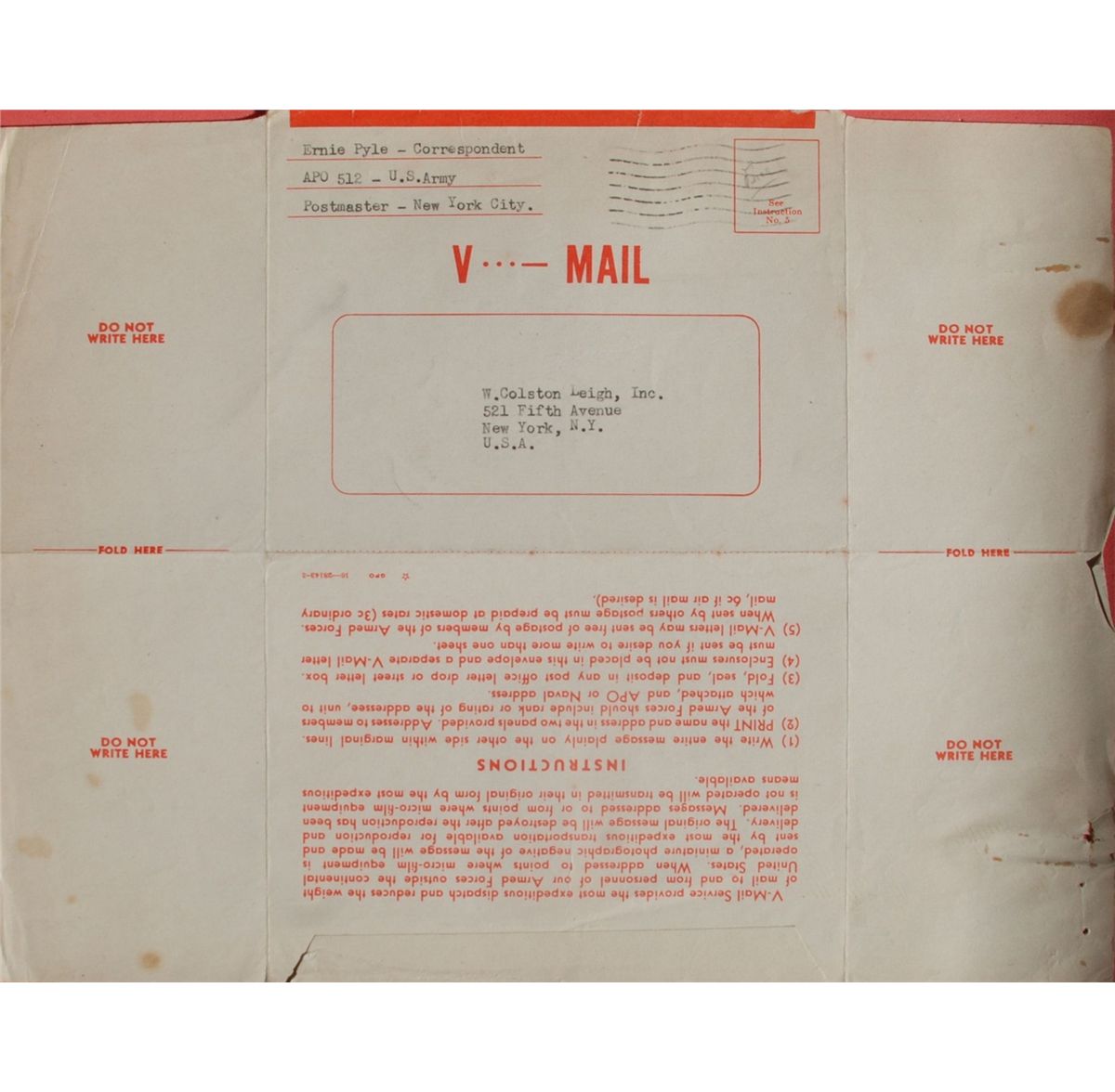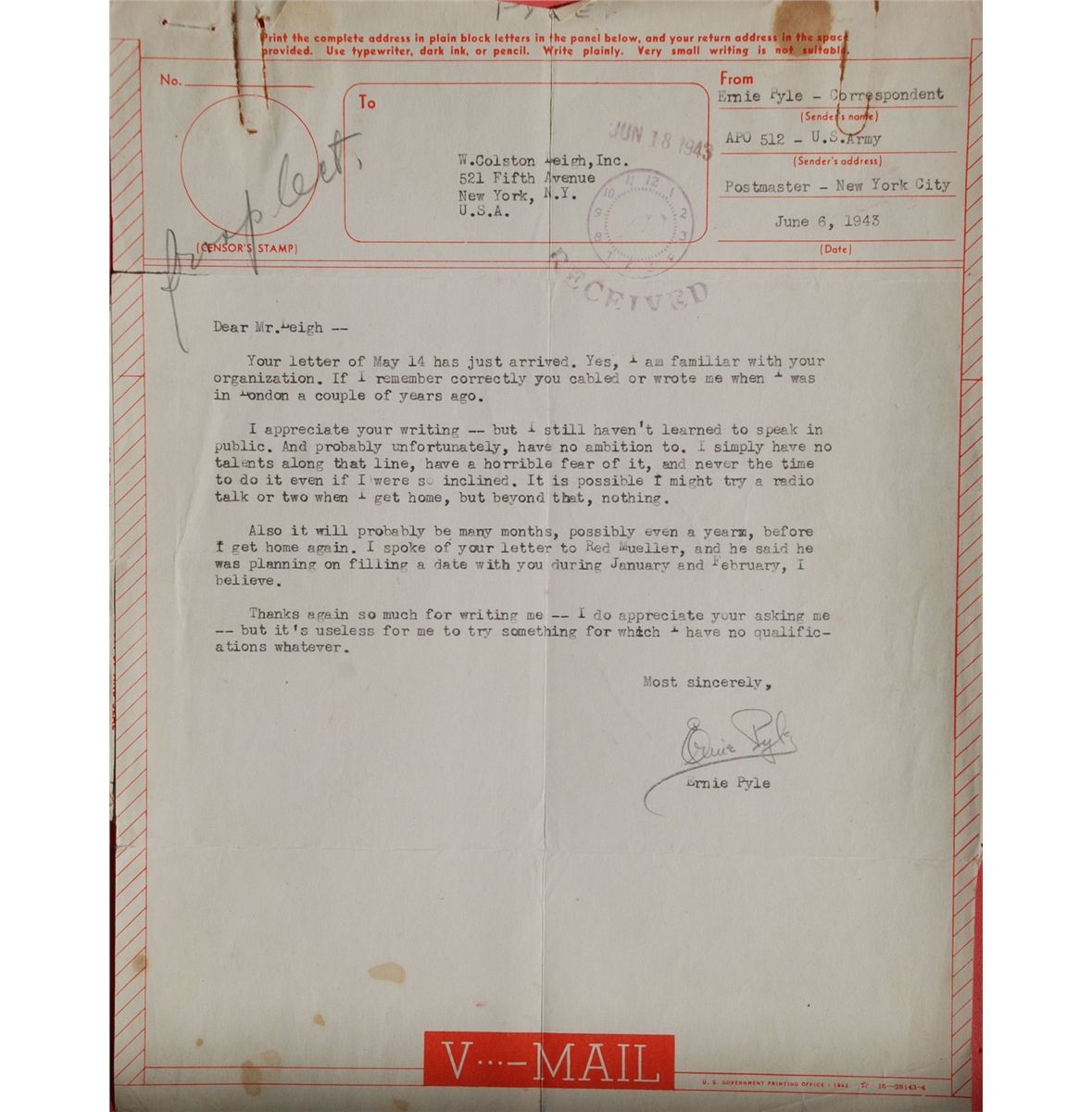 Amazing letter written to W. Colston Lee from the Lecture bureau. Pyle is a Pulitzer Prize–winning American journalist (1900–1945), best known for his wartime columns about ordinary GIs, who was killed in combat during the war. Letter dated June 6, 1943..Dear Mr. Leigh,Your letter of May 14 has just arrived. Yes I am familiar with your organization. If I remember correctly you cabled or wrote me when I was in London a couple of years ago.