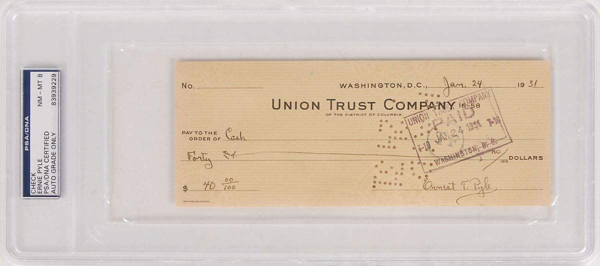Pulitzer Prize–winning war correspondent (1900–1945) best known for his work during World War II. Bank check, 7.75 x 3, filled out and signed by Pyle, "Ernest T. Pyle," payable to Cash for $40, January 24, 1931. Encapsulated in a plastic PSA/DNA authentication and grading holder, evaluating the signature as "NM-MT 8." In fine condition.
