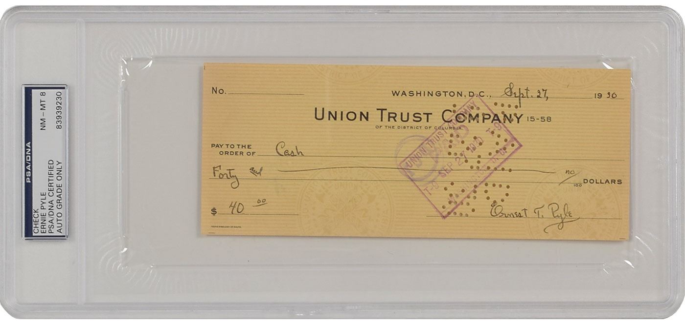 Union Trust Company of the District of Columbia check, 7.75 x 3, filled out and signed by Pyle, "Ernest T. Pyle," payable to Cash for $40, September 27, 1930. Encapsulated in a plastic PSA/DNA authentication and grading holder, evaluating the autograph as "NM-MT 8." In fine condition.
