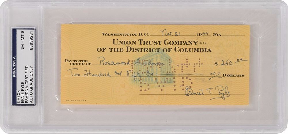 Union Trust Company of the District of Columbia check, 6.25 x 2.75, filled out and signed by Pyle, "Ernest T. Pyle," payable to Rosamond Goodman for $250, November 21, 1944. Encapsulated in a plastic PSA/DNA authentication and grading holder, evaluating the check as "NM–MT 8." In fine condition.