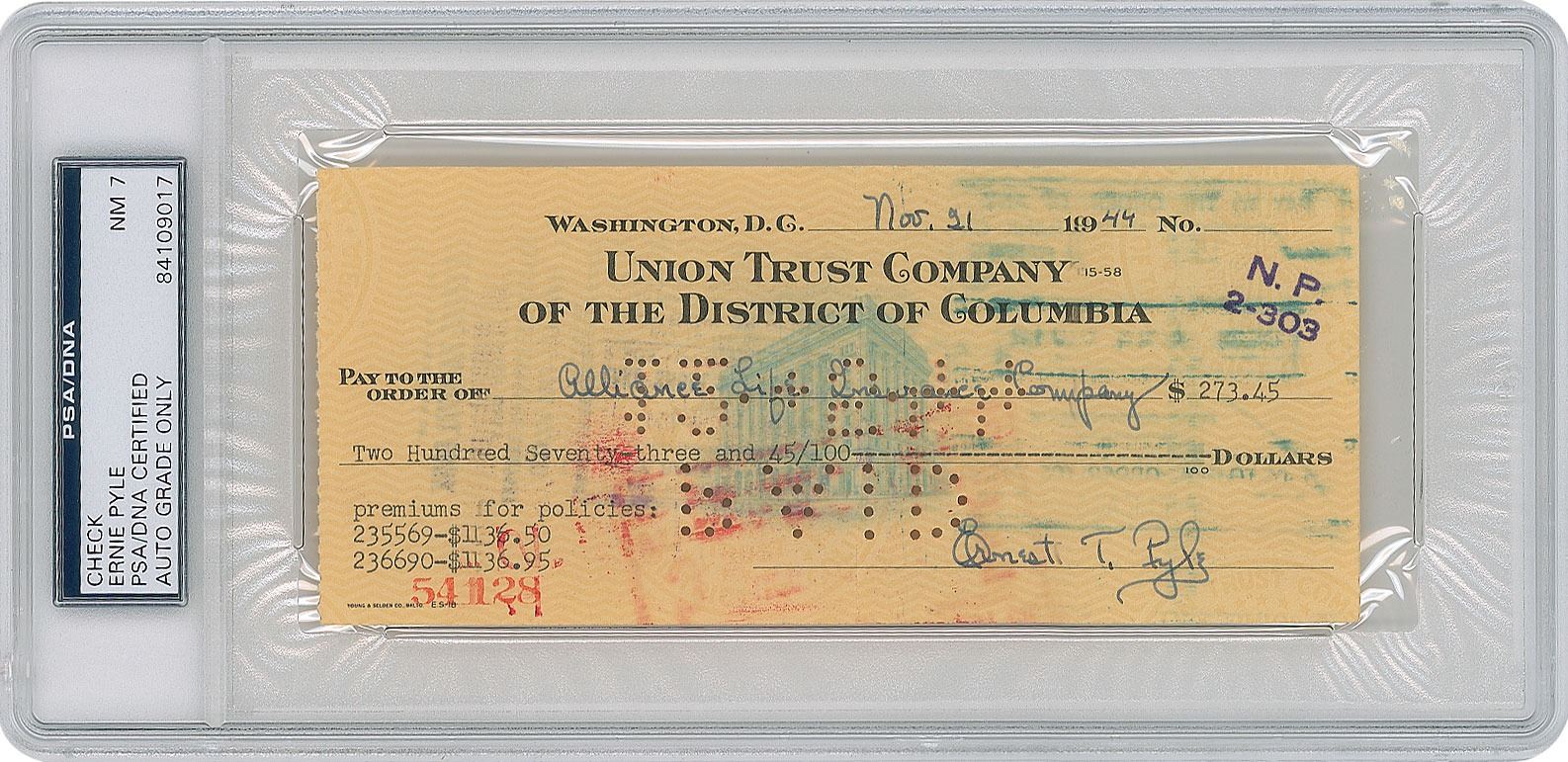 Union Trust Company of the District of Columbia check, 6.25 x 2.75, filled out and signed by Pyle, "Ernest T. Pyle," payable to Alliance Life insurance Company for $273.45, November 21, 1944. In fine condition. Encapsulated in a plastic PSA/DNA authentication and grading holder, evaluating the autograph as "NM 7."