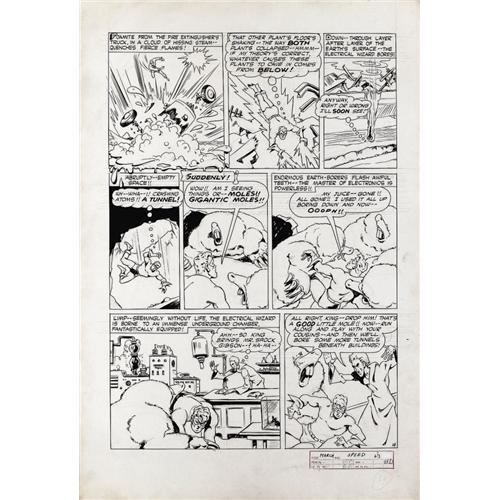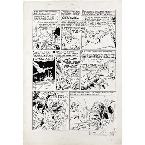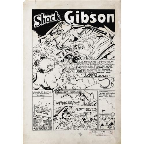 <B>Ernie Schroeder (attributed) - Speed Comics #31 Complete 8-page Shock Gibson Story, "Monsters Who Bred Earthquakes" Original Art (Harvey, 1944).</B></I> Giant rats and moles are no match for the scintillating Shock Gibson. Ernie Schroeder provides the electrifying action-filed art for this eight-page extravaganza. The image area of each page measures approximately 12.5" x 18", and the art is in Very Good condition. <BR><BR><B>Important notice:</B> Heritage usually auctions material at the rate of 200-250 lots per hour. On some occasions eBay Live bid software or the Internet may not be able to keep up with the pace of the auction. We recommend placing a realistic absentee bid now as insurance to avoid disappointment. Occasionally the auctioneer may eliminate or reject an eBay Live bid, and the auctioneer may also reopen a lot after the close of the eBay live bidding (usually because we missed an audience bid), and may reject your bid even if it shows you as the winning bidder. By bidding via eBay Live, you agree that Heritage may award the lot to another bidder at its sole discretion under the circumstances described above or any other reasonable circumstances. Since eBay bids are not shown to us until we open the lot on the floor, we treat those bids just like floor bids. In most cases the floor responds before the eBay bid is presented to us, due to Internet lag time, so for consistency we have made it a policy that floor bids are always considered first over tie eBay live bids. Also please note that all Heritage lots purchased through eBay Live carry a 22.5% Buyer's Premium. Please make sure you read the Terms and Conditions before you bid. This lot is being auctioned in conjunction with a live floor auction by Heritage Auction Galleries. All final auction and invoice information will be supplied by Heritage Auction Galleries, and all other information should be considered preliminary. Lot:41001 <BR><BR><B>Winning Notification and Billing:</B> After the FINAL session in this auction is complete, Heritage will send e-mail and snail mail invoices. This process normally takes several days. All final auction and invoice information will be supplied by Heritage Auction Galleries, and all other information should be considered preliminary. <BR><BR>This auction will be conducted on a live auction floor and over the Internet through eBay Live. If you choose to place an absentee bid, please take a moment to <font color='#0000ff'><u><a href='http://pages.ebay.com/liveauctions/help/before/laabsentee.html'>learn how eBay Live absentee bidding works</a></u></font><font color='#000000'>