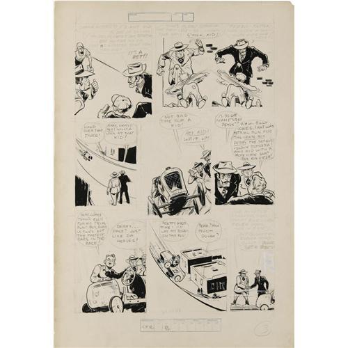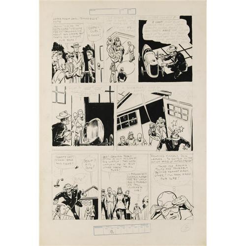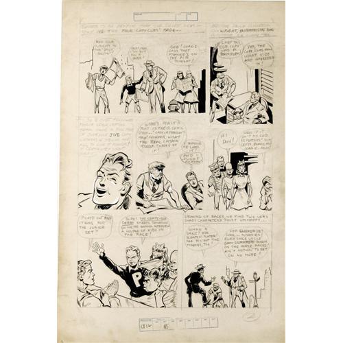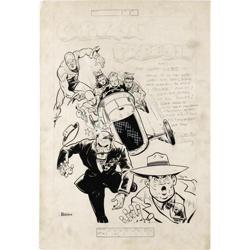 <B>Ernie Schroeder (attributed) - Complete Unpublished 10-page Captain Freedom Story "Crate Box Derby" Original Art (Harvey, circa 1945). </B></I> Although signed "Pelletier," these dynamic scenes featuring Captain Freedom and "the Copy Cubs" bear all the hallmarks of Ernie Schroeder's slam-bang art style. This fast-paced yarn was penciled and inked, but the lettering and panel borders still remain in their "roughed-in" pencil state and were never inked in. Each page has an approximate image area of 12.5" x 18" and aside from some overall aging, the art is in Very Good condition. <BR><BR><B>Important notice:</B> Heritage usually auctions material at the rate of 200-250 lots per hour. On some occasions eBay Live bid software or the Internet may not be able to keep up with the pace of the auction. We recommend placing a realistic absentee bid now as insurance to avoid disappointment. Occasionally the auctioneer may eliminate or reject an eBay Live bid, and the auctioneer may also reopen a lot after the close of the eBay live bidding (usually because we missed an audience bid), and may reject your bid even if it shows you as the winning bidder. By bidding via eBay Live, you agree that Heritage may award the lot to another bidder at its sole discretion under the circumstances described above or any other reasonable circumstances. Since eBay bids are not shown to us until we open the lot on the floor, we treat those bids just like floor bids. In most cases the floor responds before the eBay bid is presented to us, due to Internet lag time, so for consistency we have made it a policy that floor bids are always considered first over tie eBay live bids. Also please note that all Heritage lots purchased through eBay Live carry a 22.5% Buyer's Premium. Please make sure you read the Terms and Conditions before you bid. This lot is being auctioned in conjunction with a live floor auction by Heritage Auction Galleries. All final auction and invoice information will be supplied by Heritage Auction Galleries, and all other information should be considered preliminary. Lot:41001 <BR><BR><B>Winning Notification and Billing:</B> After the FINAL session in this auction is complete, Heritage will send e-mail and snail mail invoices. This process normally takes several days. All final auction and invoice information will be supplied by Heritage Auction Galleries, and all other information should be considered preliminary. <BR><BR>This auction will be conducted on a live auction floor and over the Internet through eBay Live. If you choose to place an absentee bid, please take a moment to <font color='#0000ff'><u><a href='http://pages.ebay.com/liveauctions/help/before/laabsentee.html'>learn how eBay Live absentee bidding works</a></u></font><font color='#000000'>