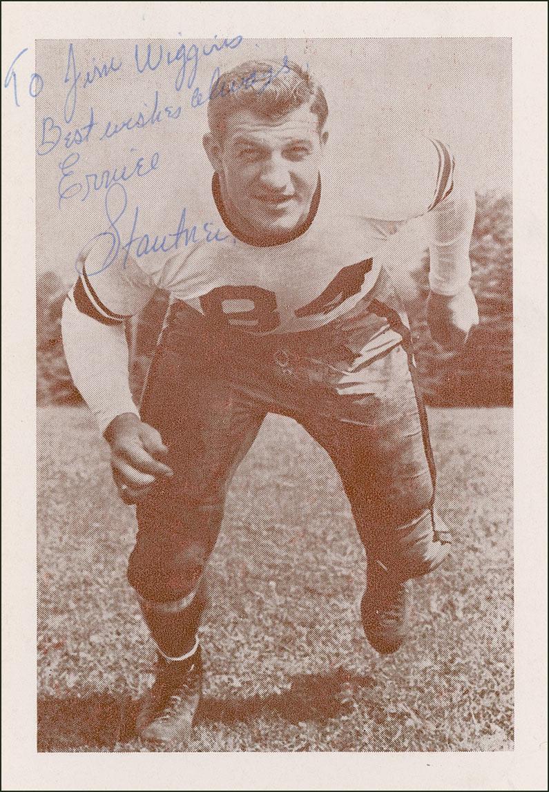 Pro Football Hall of Famer (1925-2006). Cardstock 4 x 5.75 photo of Stautner in uniform, signed and inscribed in blue ballpoint “To Jim Wiggins, Best wishes always, Ernie Stautner.” In fine condition.