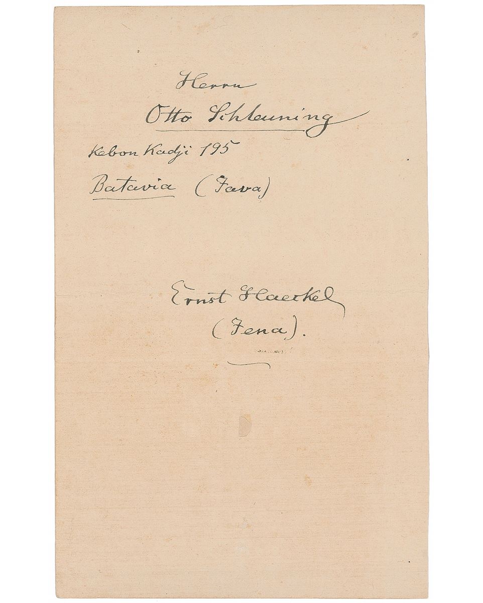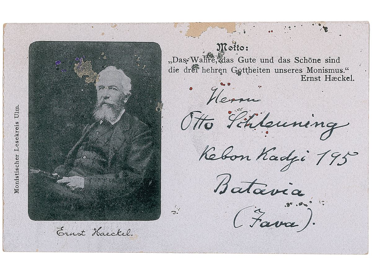 Influential German evolutionist, morphologist, and developmental biologist (1834–1919). Two items: a 5.25 x 3.25 postcard photo of Heackel featuring a printed quote, signed and inscribed in black ink to Otto Schleuning; and the cover of a softcover edition of Die Weltrathsel, similarly signed and inscribed on the reverse. In overall very good condition, with scattered soiling, stray ink flecks, and small areas of surface loss to the postcard photo, and three horizontal folds to the book cover (one passing through the signature).