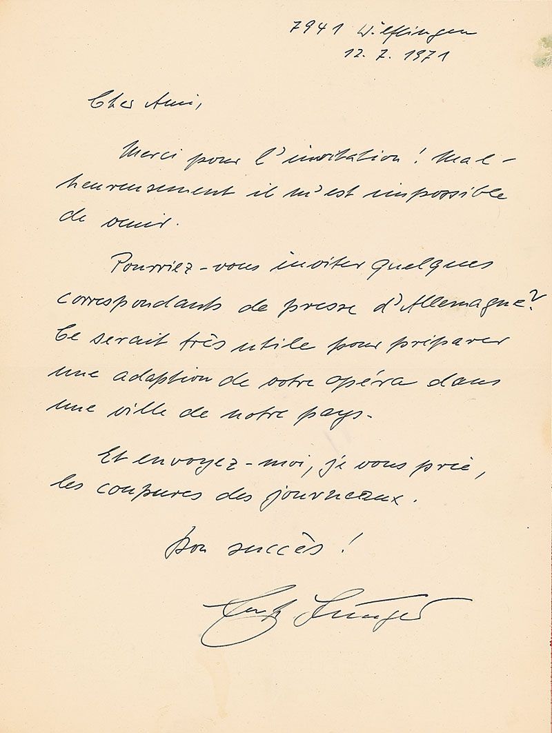 German writer (1895–1998) known for his book Storm of Steel. ALS in French, one page, 8.25 x 11, July 12, 1971. Untranslated letter to a friend. In fine condition, with central horizontal and vertical folds, one through a single letter of signature, small