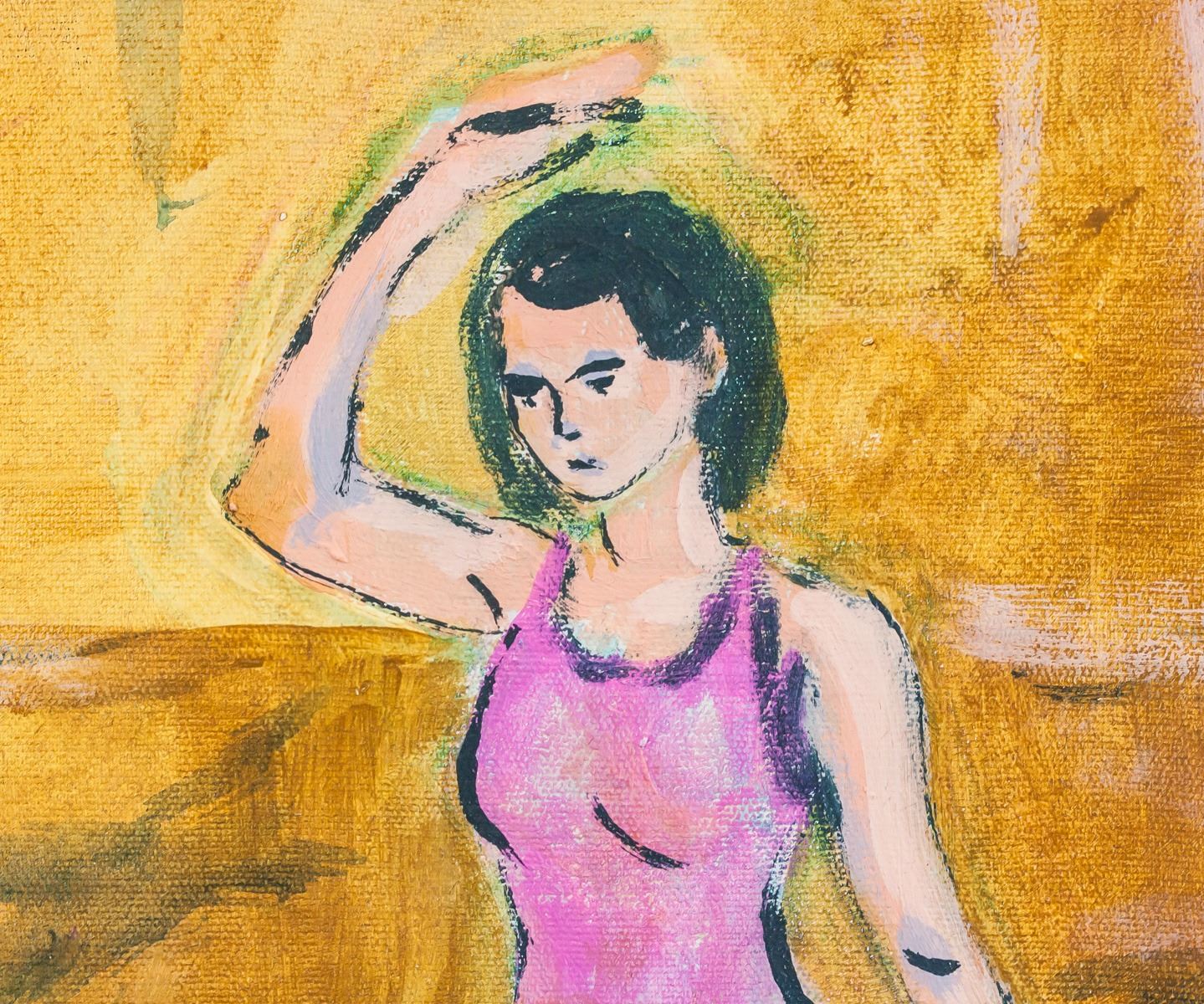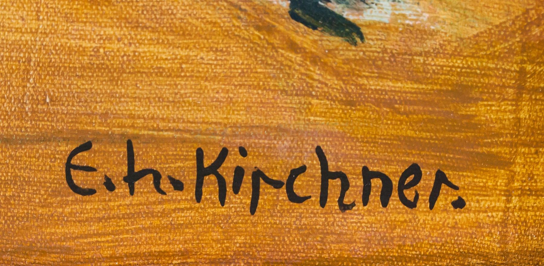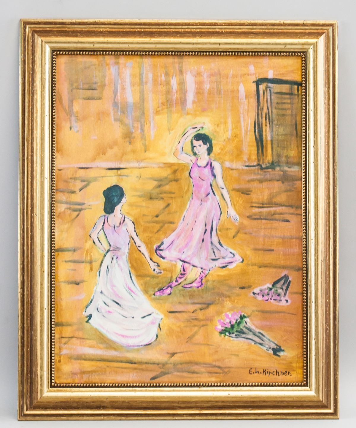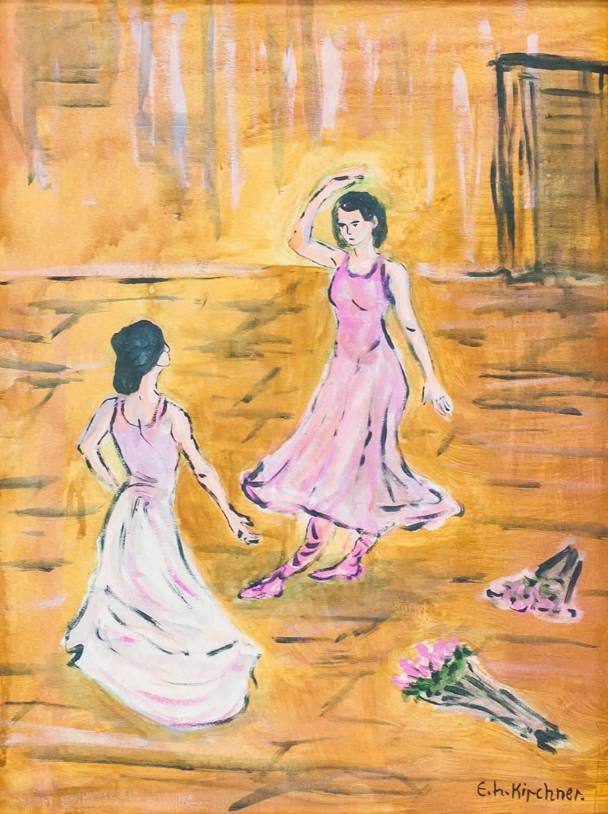 Oil on canvas, framed. Featuring two women in pink dresses dancing. Two bouquets of flowers lie beside them on the ground. Signed "E. L. Kirchner" to the bottom right. Attributed to Ernst Kirchner (1880-1938, German). 49.5 x 37.5 cm (19.4 x 14.7 in), Frame: 59 x 48 cm (23.25 x 19 in).
