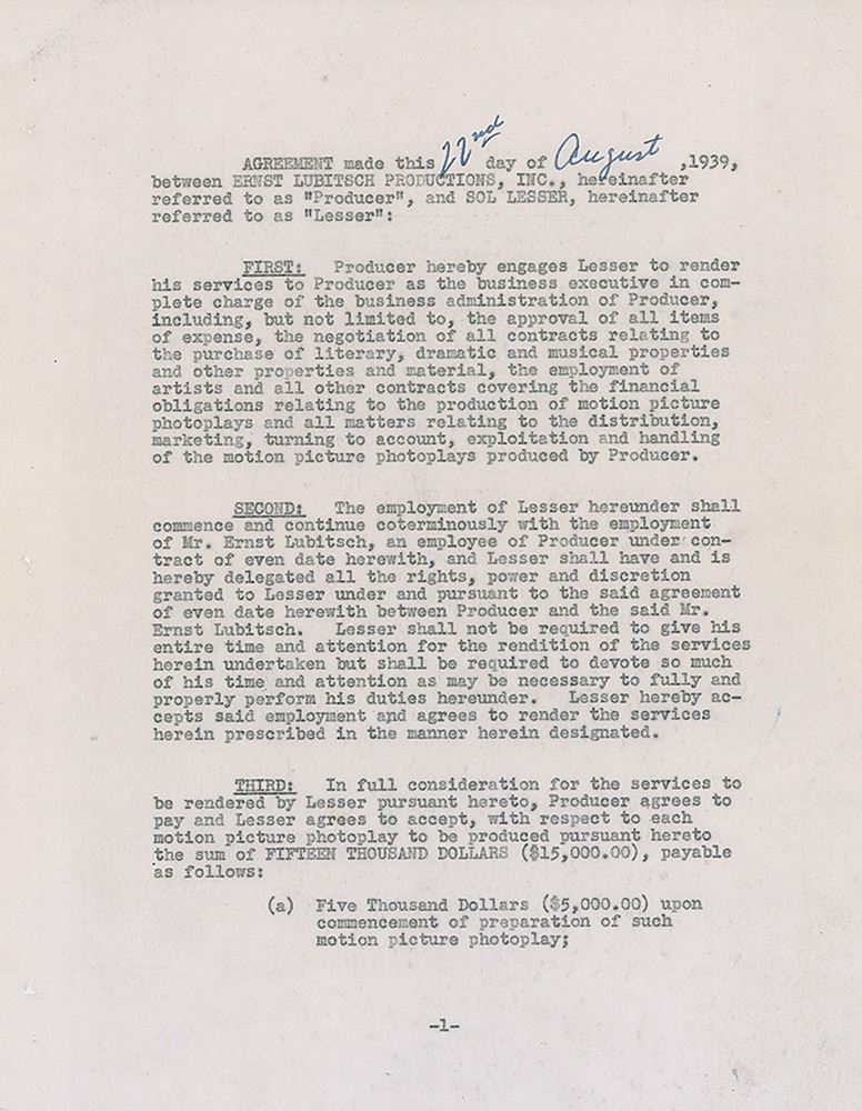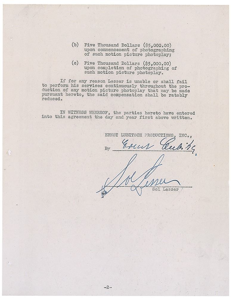 DS, two onionskin pages, 8.5 x 11, August 22, 1939. Agreement between Lubitsch Productions and Sol Lesser in which Lubitsch hires "Lesser to render his services to Producer as the business executive in complete charge of the business administration of Producer." Signed at the conclusion by both Lubitsch and Lesser. In fine condition, with binding holes to left edge and a puncture to bottom of the first letter of Lesser's signature.