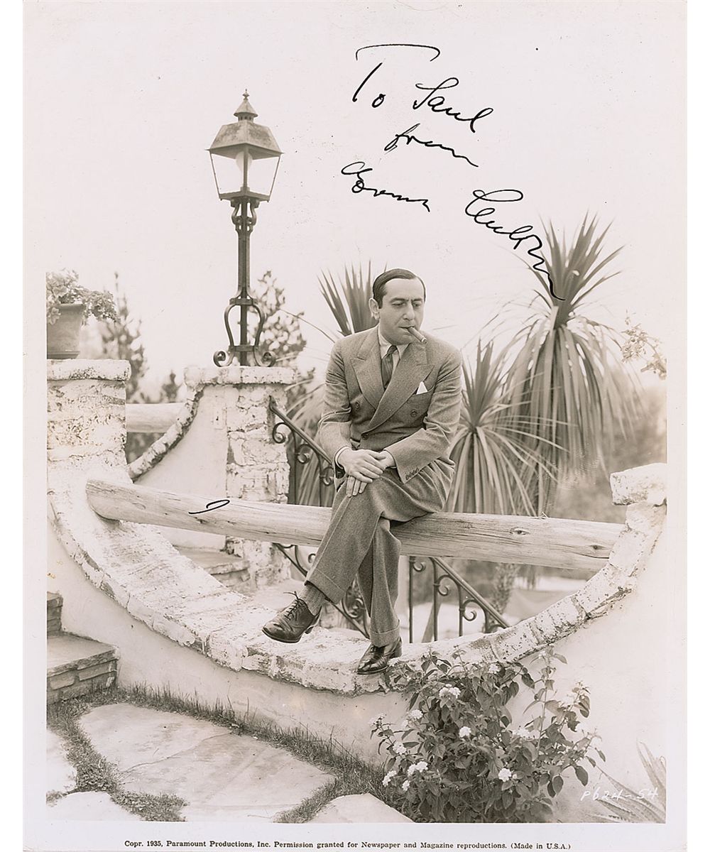 Legendary film director (1892–1947) best known for his sophisticated comedies and the fabled ‘Lubitsch touch.’ Vintage 8 x 10 Paramount Pictures publicity photo of Lubitsch smoking a cigar at his home, signed and inscribed in fountain pen, “To Paul, from Ernst Lubitsch.” Central vertical surface bends and creases, light scattered impressions, and a stray ink mark, otherwise fine condition.
