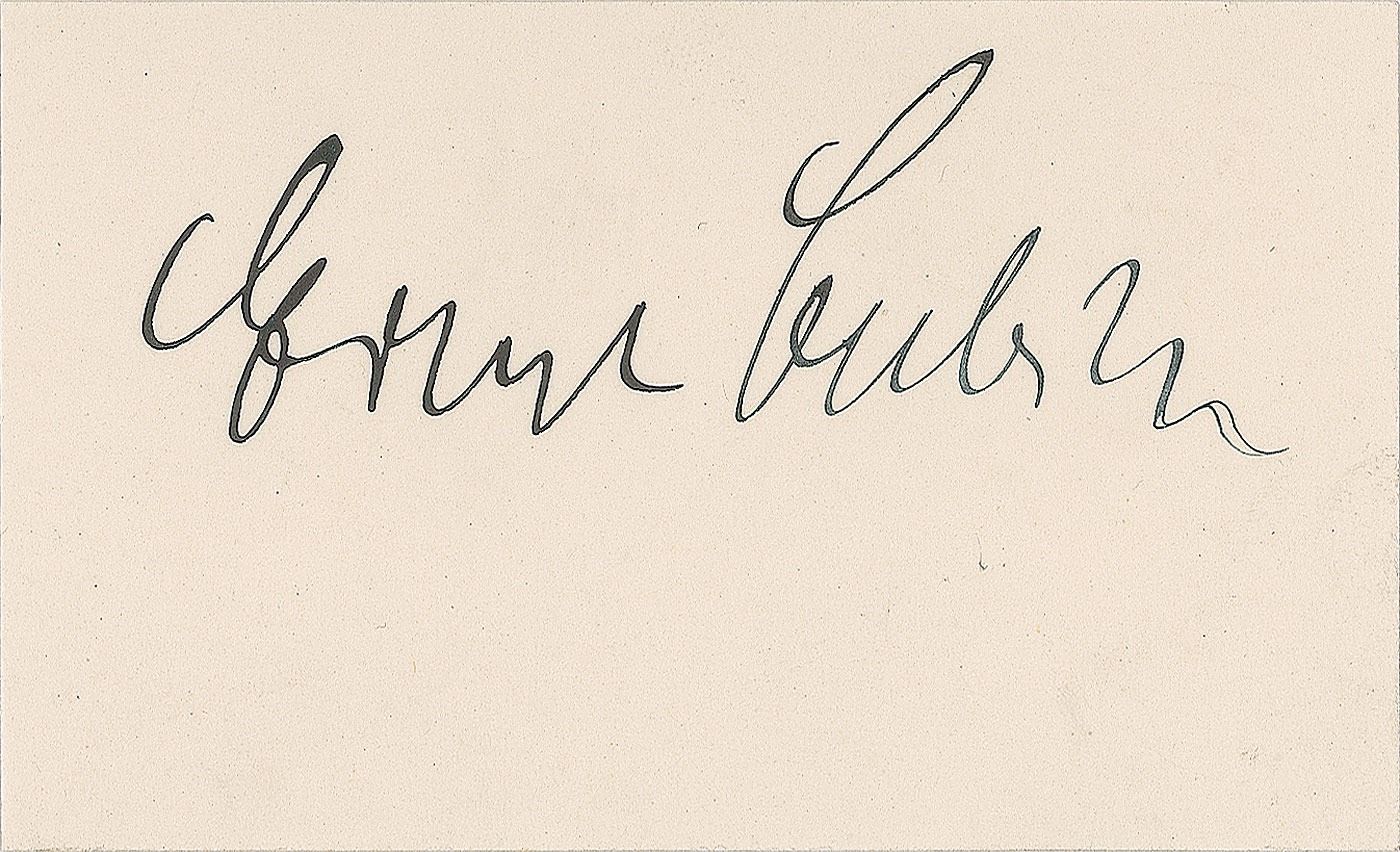 Legendary film director (1892–1947) best known for his sophisticated comedies and the fabled 'Lubitsch touch.' Fountain pen signature, "Ernst Lubitsch,” on an off-white 3.25 x 2 card. In very fine condition. Accompanied by an unsigned vintage postcard photo.