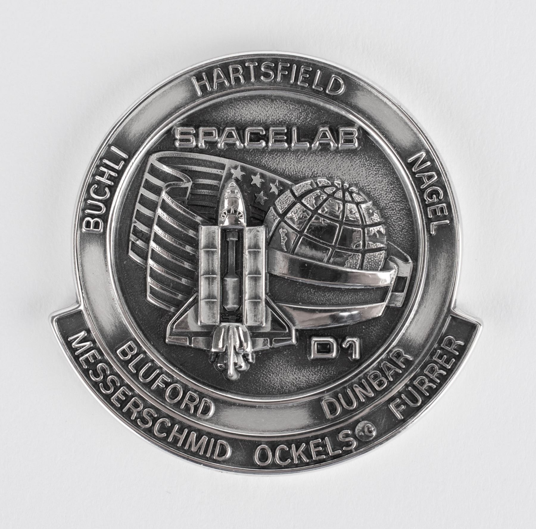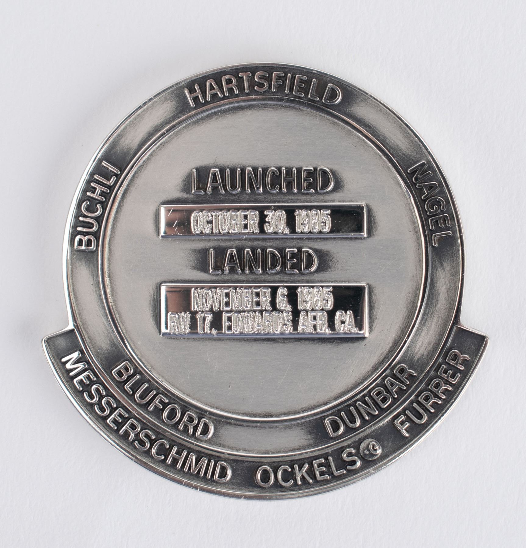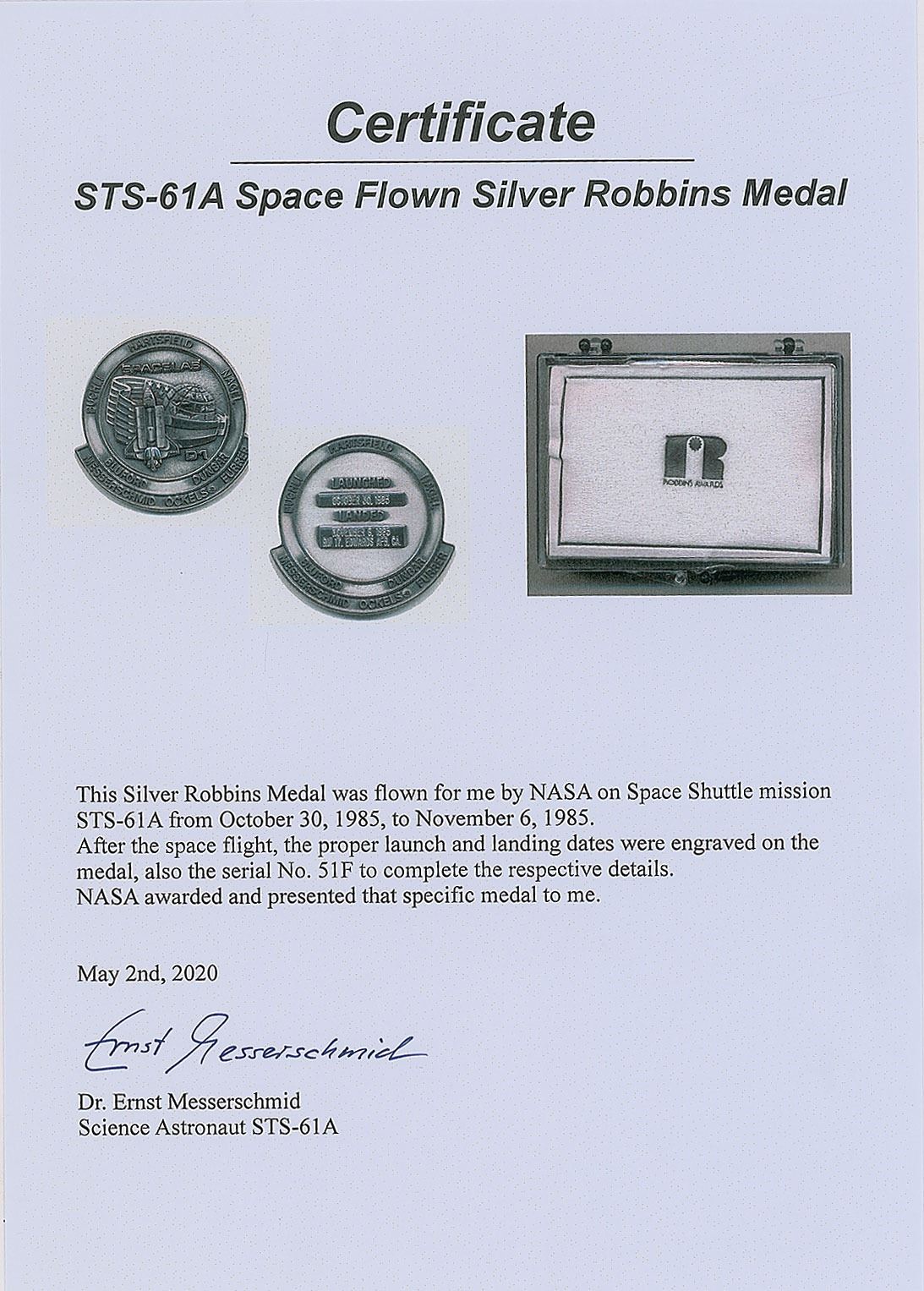 Ernst Messerschmid's flown sterling silver STS-61-A Robbins medal, approximately 1.75˝ x 1.5˝, with a raised design on the face featuring the mission insignia, and the reverse is encircled by the names of the astronauts and is engraved with the launch date of October 30, 1985, and landing date of November 6, 1985, at “RW 17 Edwards AFB, CA.” The medal is serial numbered "51F" on the rim. Condition is mint state. Accompanied by its original matching case and by a signed letter of authenticity from Messerschmid, in part: "This Silver Robbins Medal was flown for me by NASA on Space Shuttle mission STS-61A…After the space flight, the proper launch and landing dates were engraved on the medal, also the serial No. 51F to complete the respective details. NASA awarded and presented this specific medal to me.”