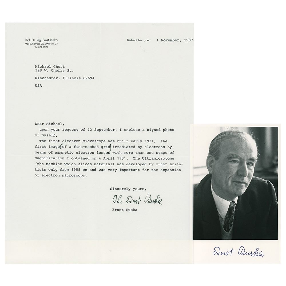 German physicist (1906-1988) who won the Nobel Prize in Physics in 1986 for his work in electron optics, including the design of the first electron microscope. Two items: a glossy 4 x 6 head-and-shoulders photo of Ruska, signed in the lower border in black felt tip; and a TLS, one page, personal letterhead, November 4, 1987, in part: "The first electron microscope was built early 1931, the first image of a fine-meshed grid irradiated by electrons by means of magnetic electron lenses with more than one stage of magnification I obtained on 4 April 1931. The Ultramicrotome (the machine which slices material) was developed by other scientists only from 1955 on and was very important for the expansion of electron microscopy." In fine condition.