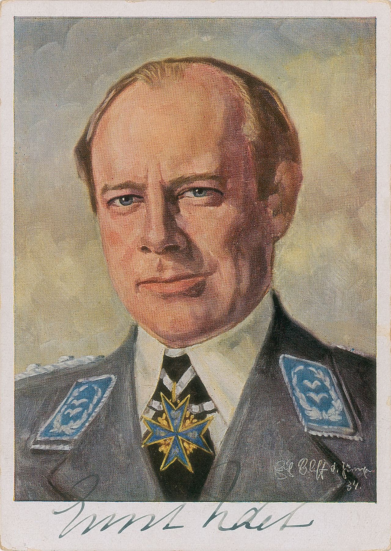 German flying ace (1896–1941) whose 62 victories during WWI made him the country's second-highest scoring ace, outdone only by Manfred von Richthofen. Color 4 x 5.75 postcard photo of Udet in uniform, signed at the bottom in fountain pen. In fine condition.